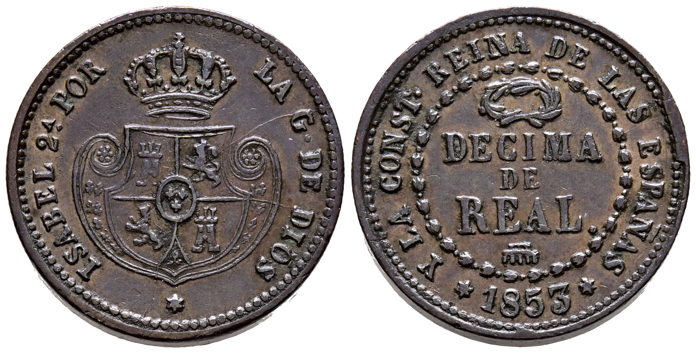 ISABEL II (1833-1868). Décima de Real. (Ae. 3,99g/19mm). 1853. Segovia. (Cal-2019-146). EBC-. Roturas de cuño en anverso.