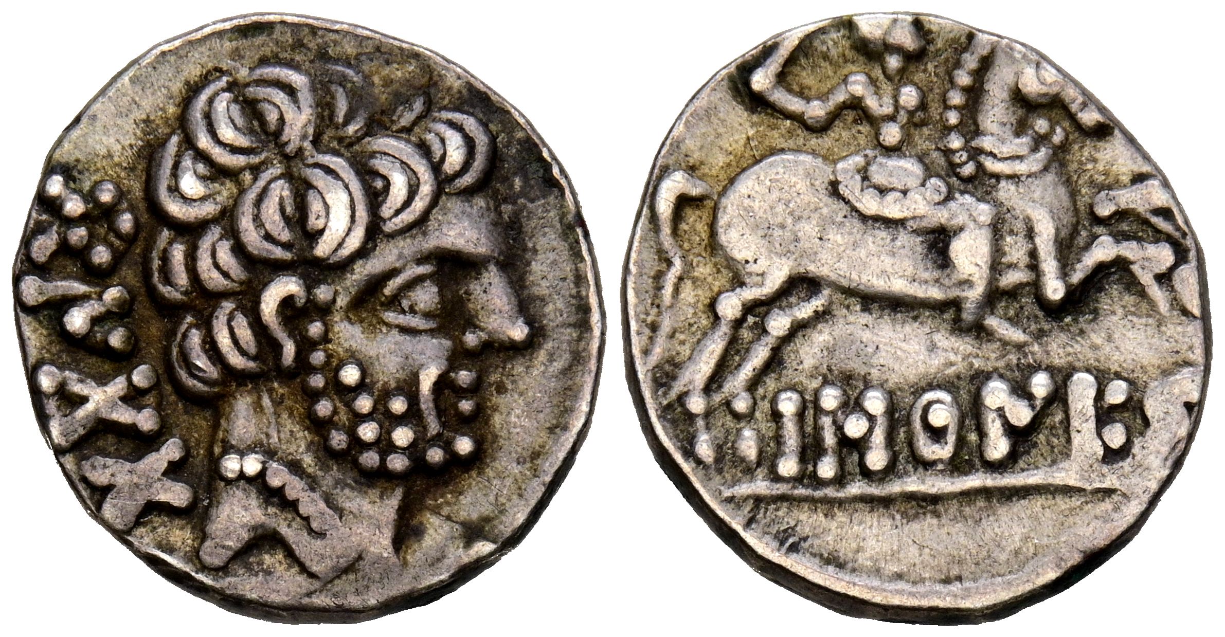 BASCUNES (Pamplona). Denario. (Ar. 3,62g/17mm). 120-20 a.C. (FAB-215). Anv: Cabeza masculina barbada a derecha, detrás leyenda ibérica: BeNCoDa. Rev: Jinete con espada a derecha, debajo leyenda ibérica: BaSCuNES. MBC+.