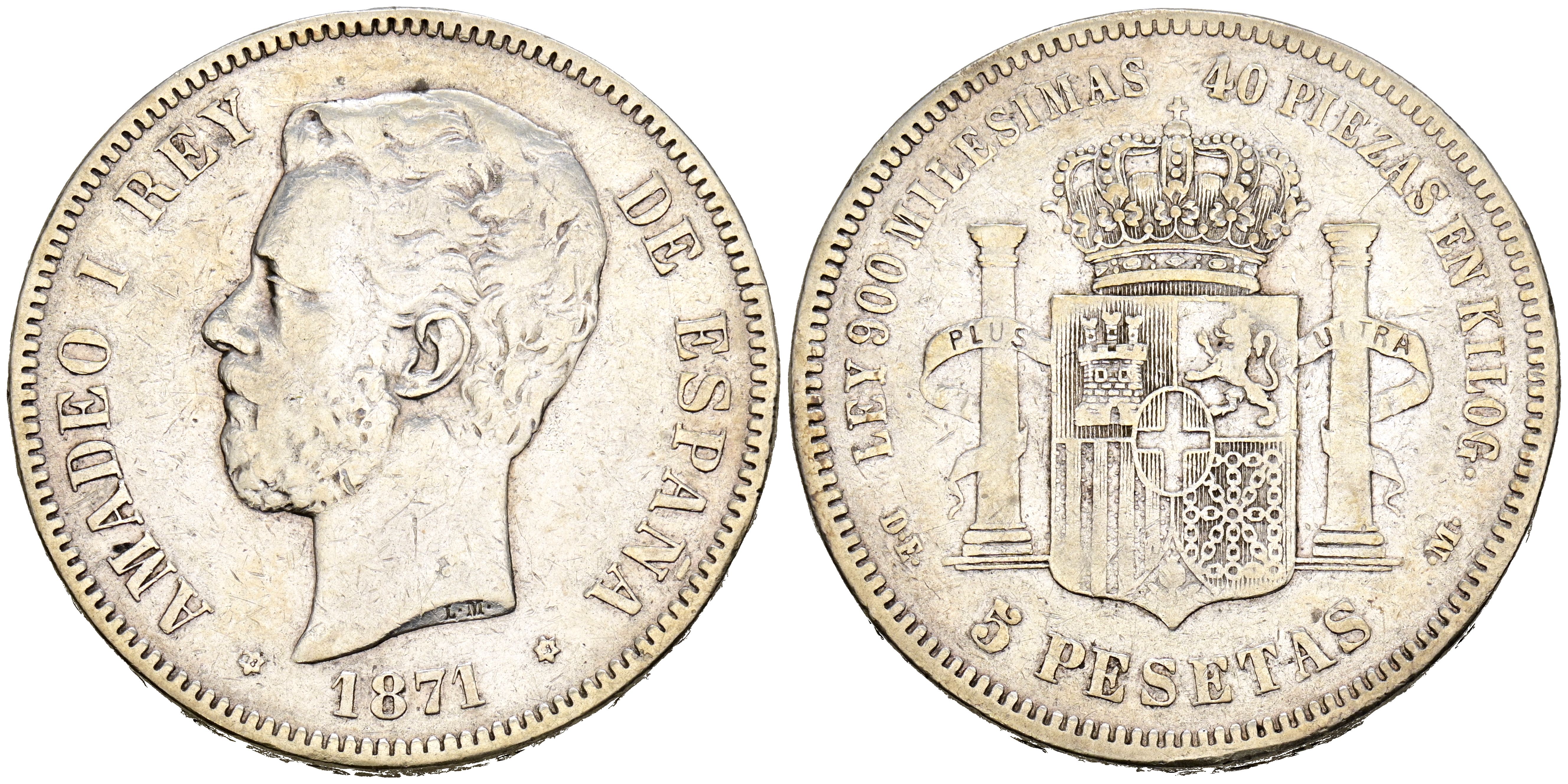 AMADEO I (1871-1873). 5 Pesetas. (Ar. 24.73g/37mm). 1871 *18-18. Madrid DEM. (Cal-2019-6). MBC-. 1 de la segunda estrella apenas visible. Escasa.