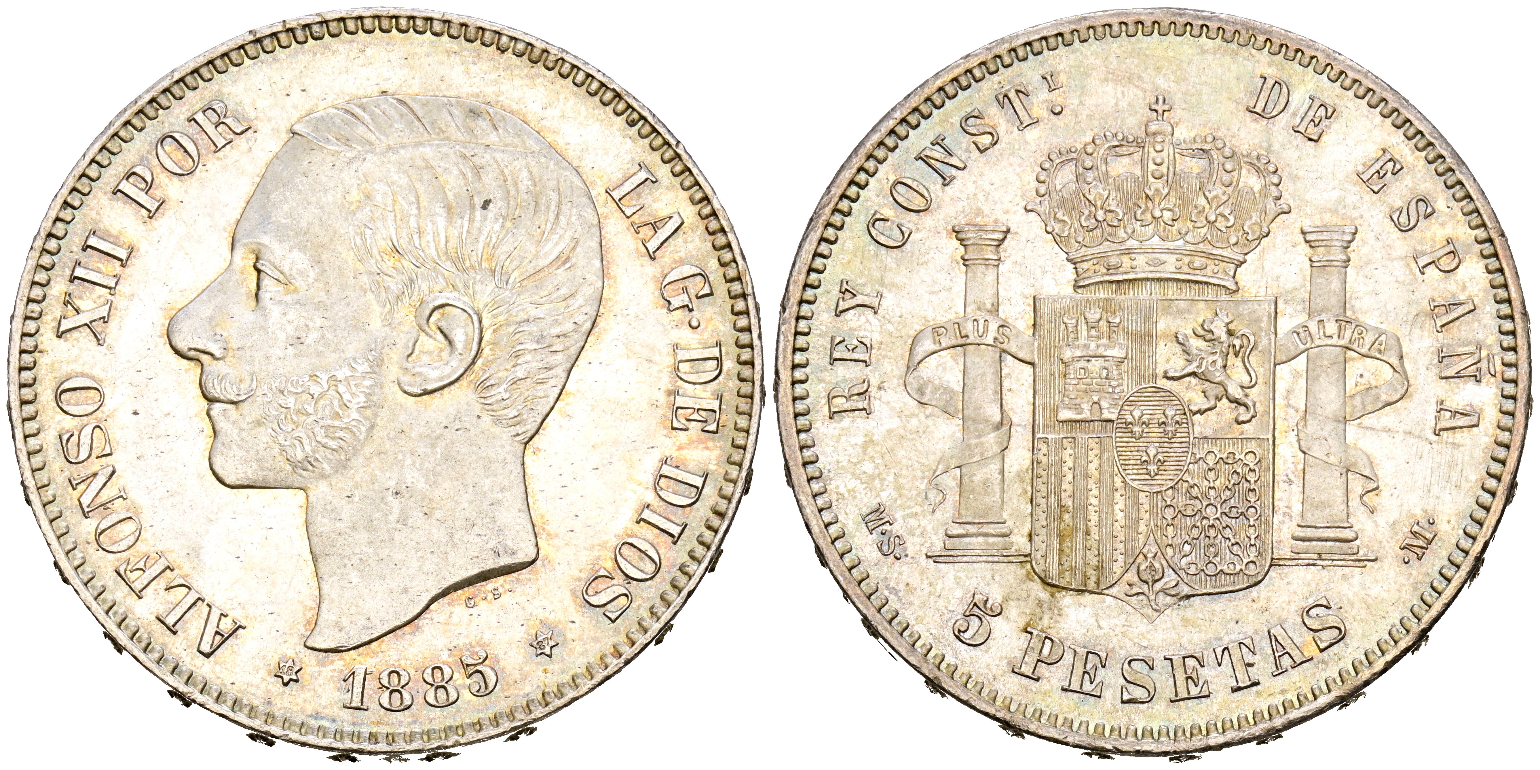 ALFONSO XII (1874-1885). 5 Pesetas. (Ar. 25,06g/38mm). 1885 *18-87. Madrid MSM. (Cal-2019-62). Acuñada bajo el reinado de Alfonso XIII. EBC-.