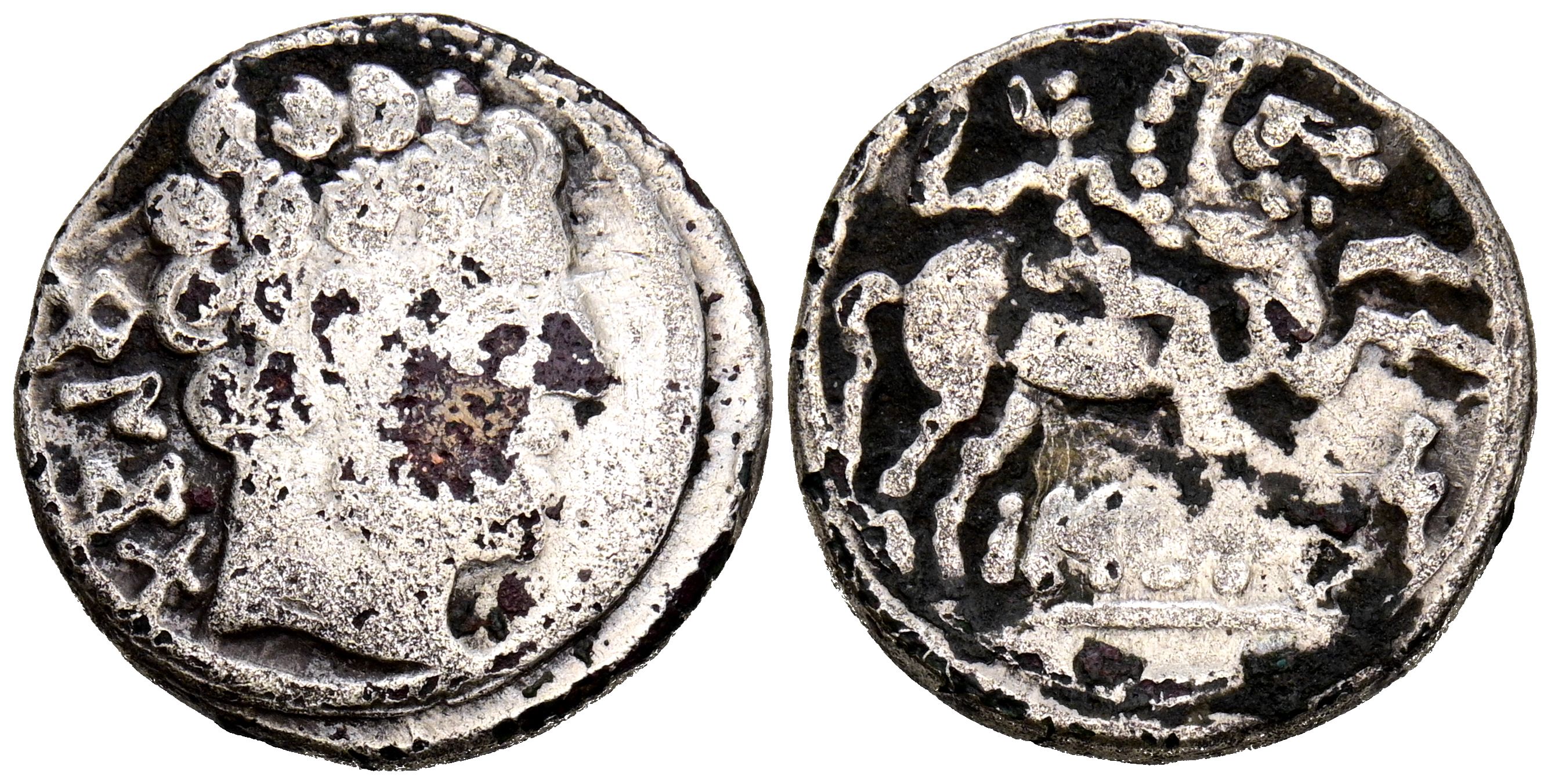 BASCUNES (Pamplona). Denario forrado (Ar-Ae. 3,53g/19mm). 120-20 a.C. (FAB-215). Anv: Cabeza masculina barbada a derecha, detrás leyenda ibérica BeNCoDa. Rev: Jinete con espada a derecha, debajo leyenda ibérica BaSCuNES. MBC-.