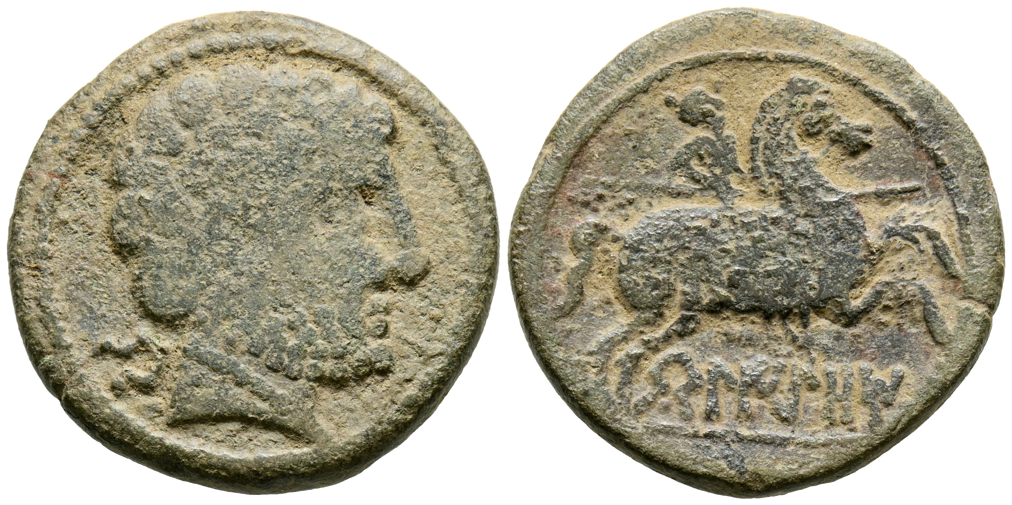 BELIGIOM (Belchite, Zaragoza). As. (Ae. 7,25/25mm). 120-20 a.C. (FAB-243). Anv: Cabeza masculina barbada a derecha, detrás letra ibérica: Be. Rev: Jinete con lanza a derecha, debajo leyenda ibérica: BeLIGiOM. MBC.