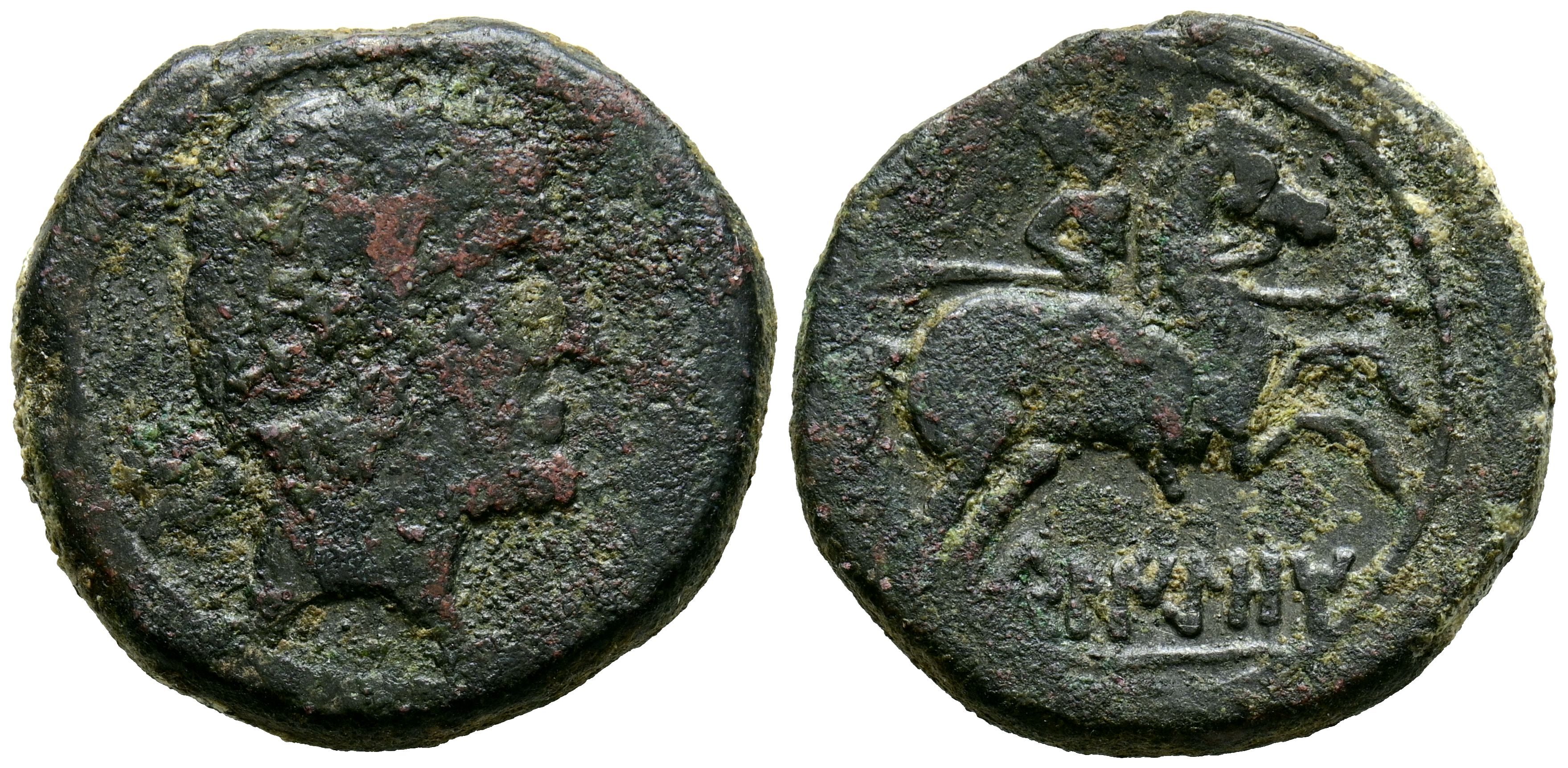 BELIGIOM (Belchite, Zaragoza). As. (Ae. 12,83/26mm). 120-20 a.C. (FAB-243). Anv: Cabeza masculina barbada a derecha, detrás letra ibérica: Be. Rev: Jinete con lanza a derecha, debajo leyenda ibérica: BeLIGiOM. BC/MBC-.