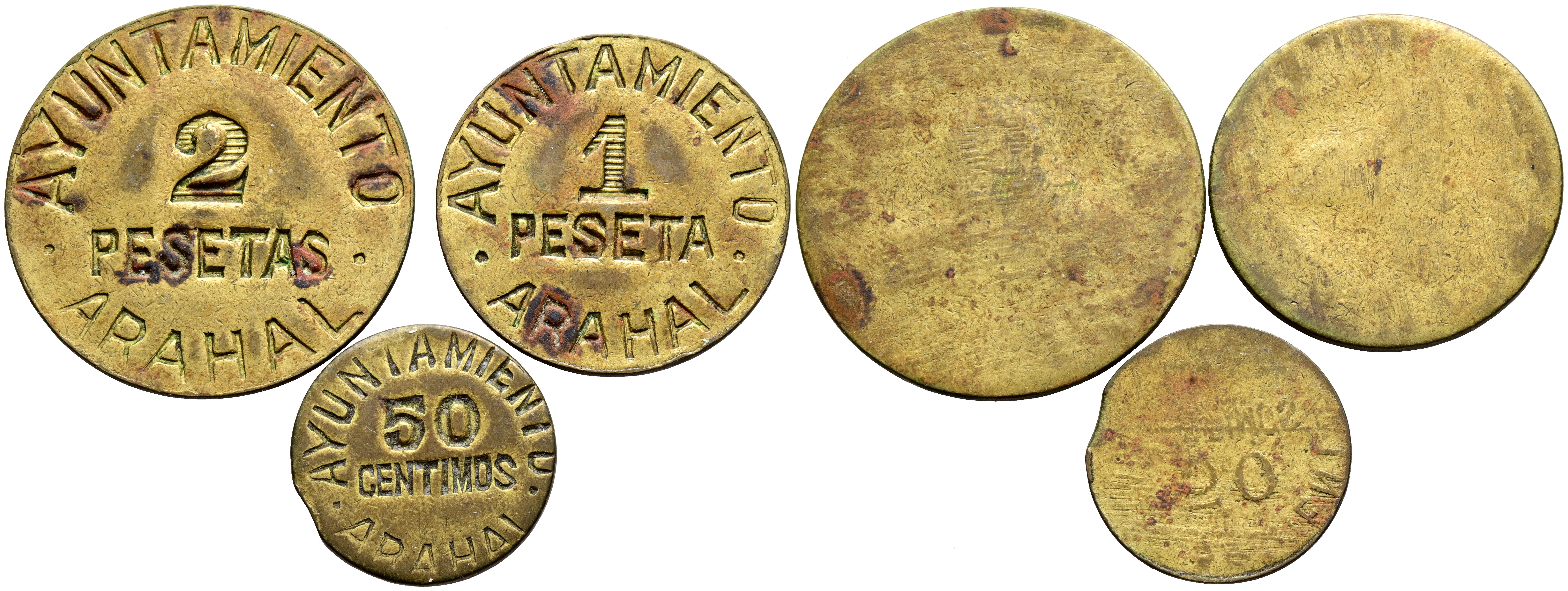 ARAHAL (Sevilla). Serie completa con 3 piezas en latón y con valores de 50 Céntimos, 1 y 2 Pesetas. S/D. (Cal-2019-40, 41 y 42). Excelente estados de conservación de las 3 monedas. A EXAMINAR.