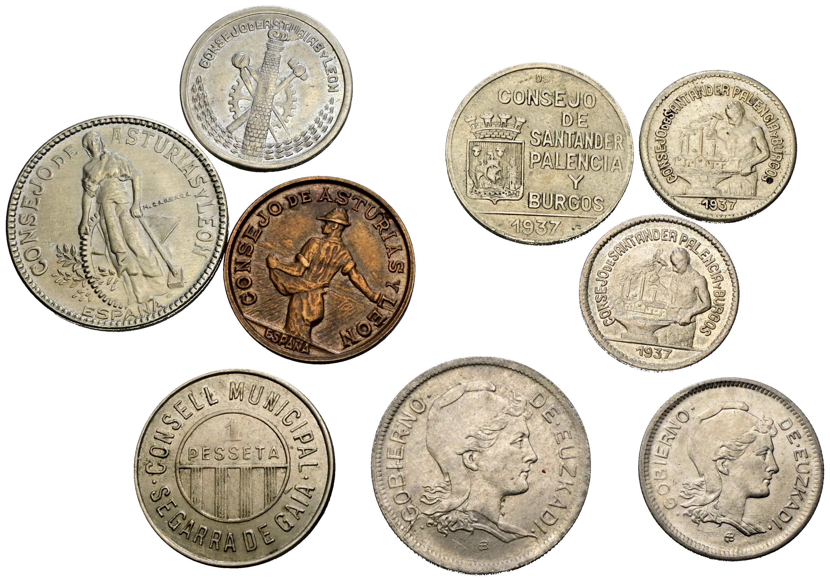 Interesante conjunto de 9 piezas, todas diferentes, y pertenecientes al Consejo de Asturias y León (completa), Santander, Palencia y Burgos (completa), Segarra de Gaiá y Euzkadi (completa). Diferentes módulos así como estados de conservación aunque con calidades medias/altas. A EXAMINAR.
