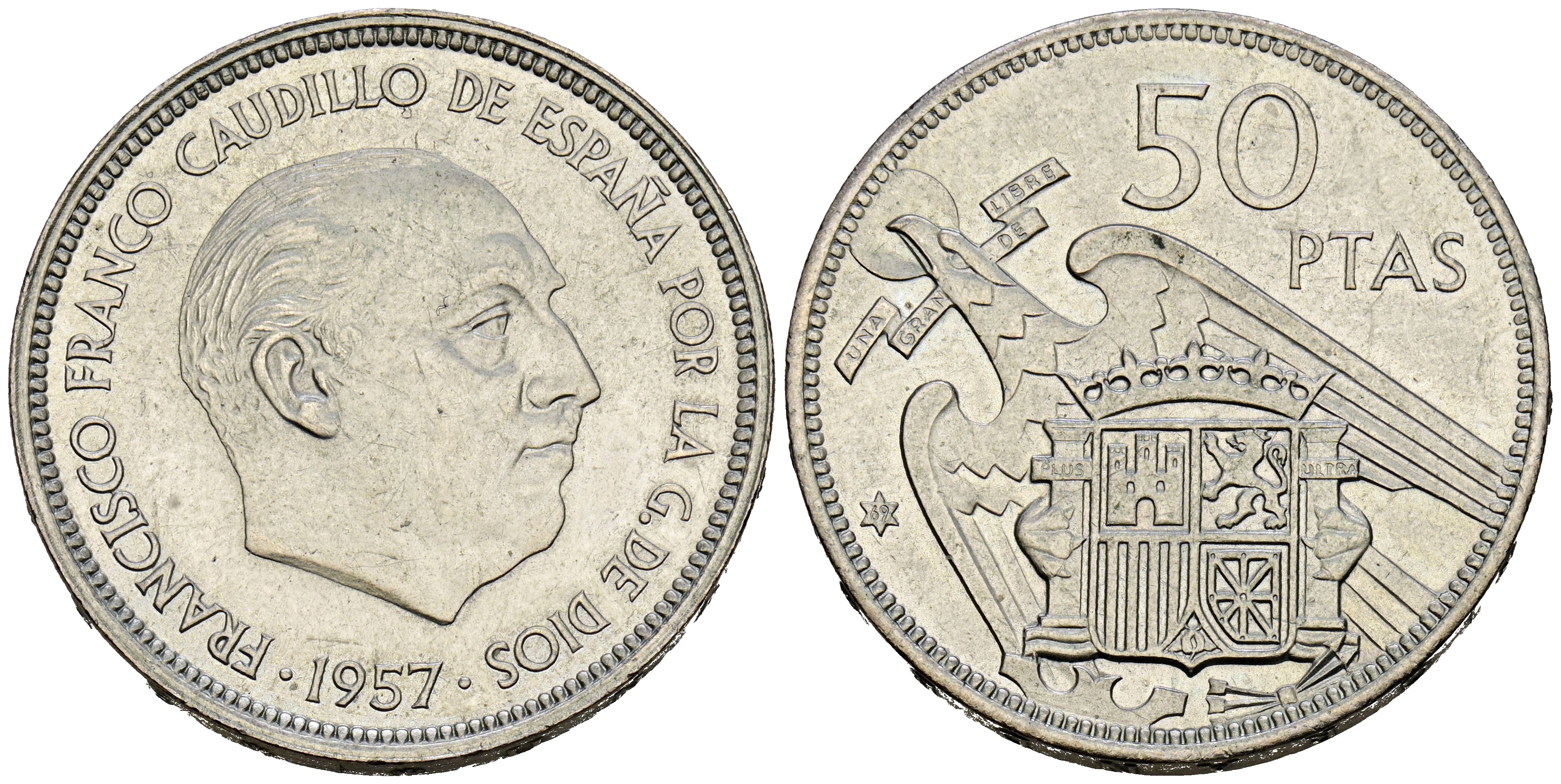 ESTADO ESPAÑOL (1936-1975). 50 Pesetas. (Ni. 12,41g/30mm). 1957 *69. Madrid. (Cal-2019-138). EBC+. Procedente de tira. Muy escaso ejemplar.