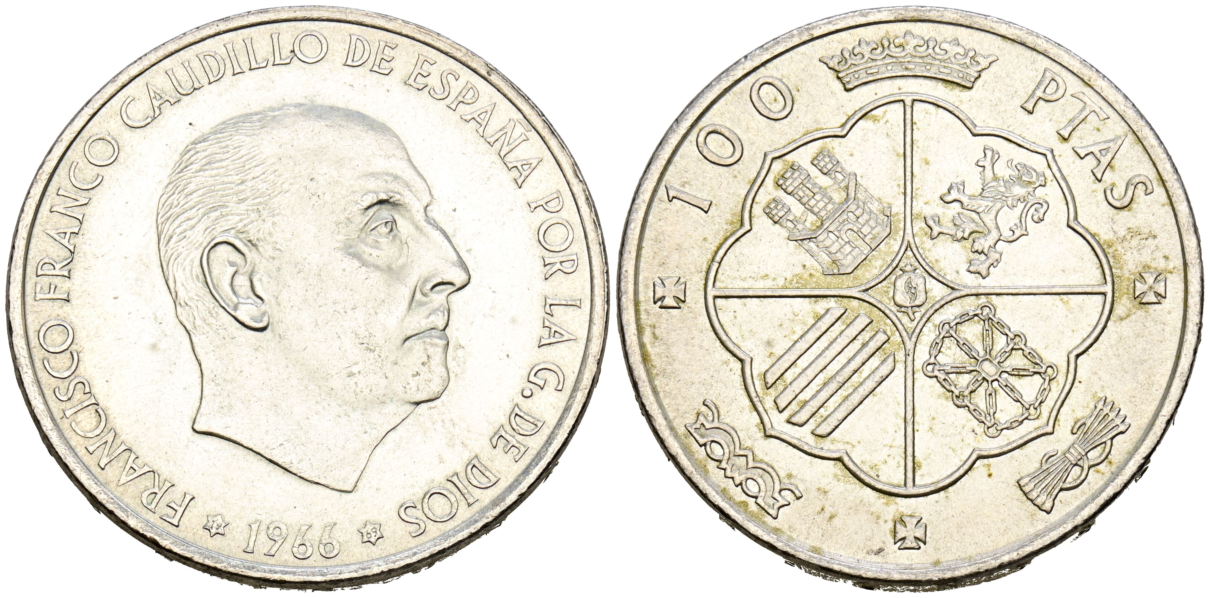 ESTADO ESPAÑOL. 100 Pesetas. (Ar. 19,14g/34mm). 1966 *19-69. Madrid. (Cal-2019-148). Palo curvo. EBC+.