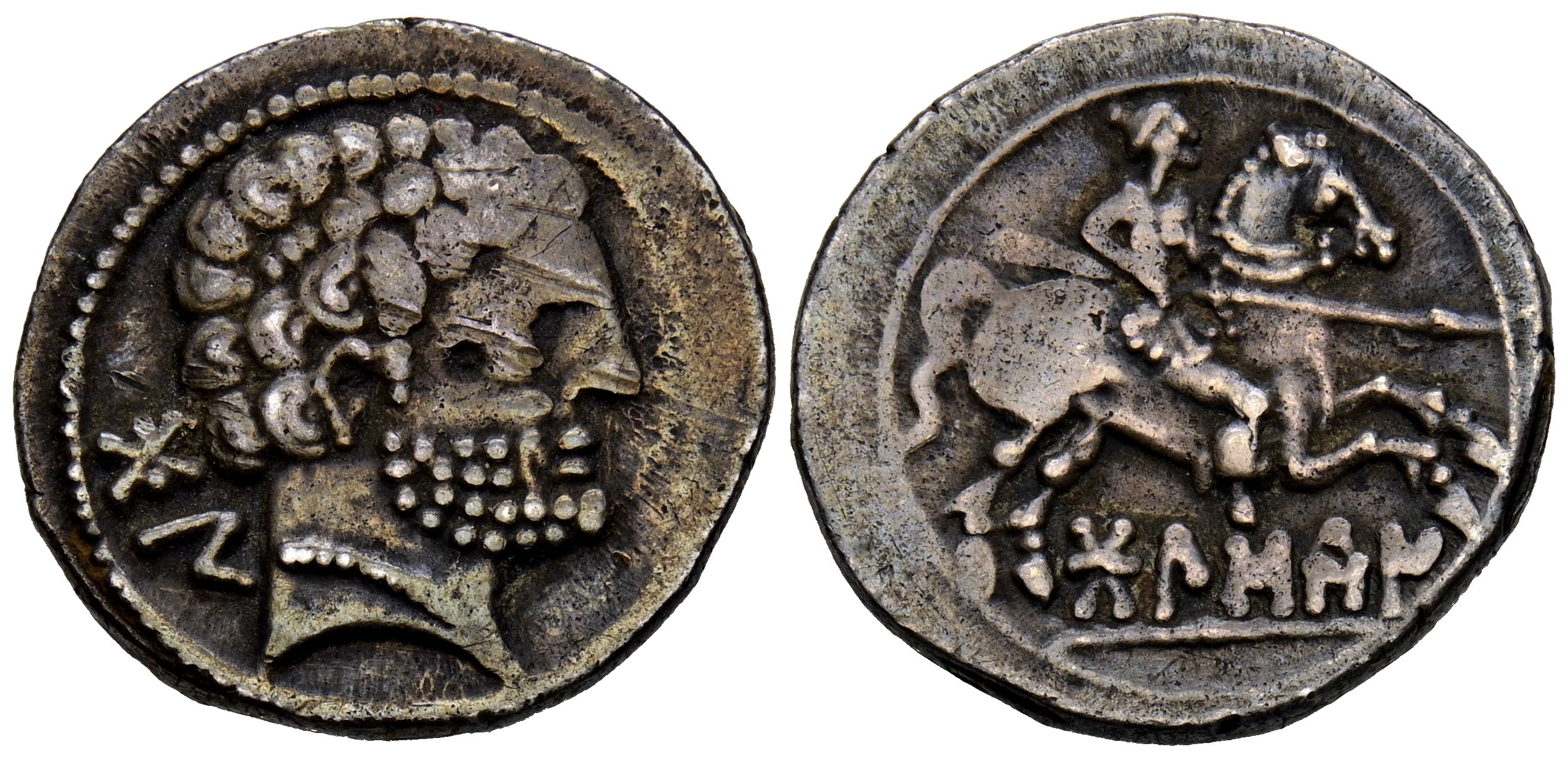 BOLSCAN (Huesca). Denario. (Ar. 4,06g/20mm). 180-20 a.C. (FAB-1911). Anv: Cabeza masculina barbada a derecha, detrás letras ibéricas: BoN. Rev: Jinete con lanza a derecha, debajo leyenda ibérica: BoLSCaN. MBC.