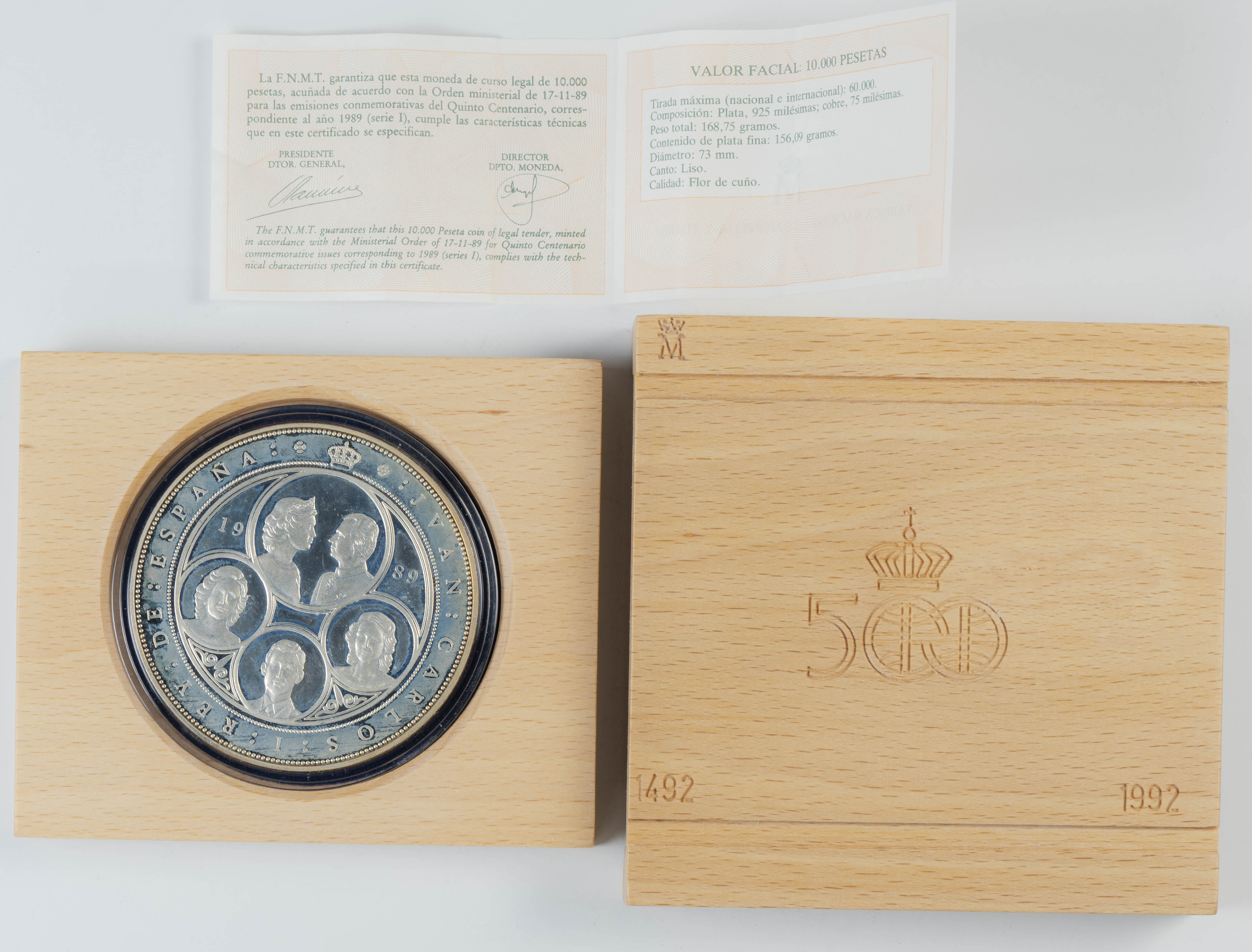 JUAN CARLOS I (1975-2014). 10.000 Pesetas. (Ar. 168,75g/73mm). Serie I. Quinto Centenario. 1989. FNMT. FDC. Presentada en estuche oficial y con certificado de autenticidad.