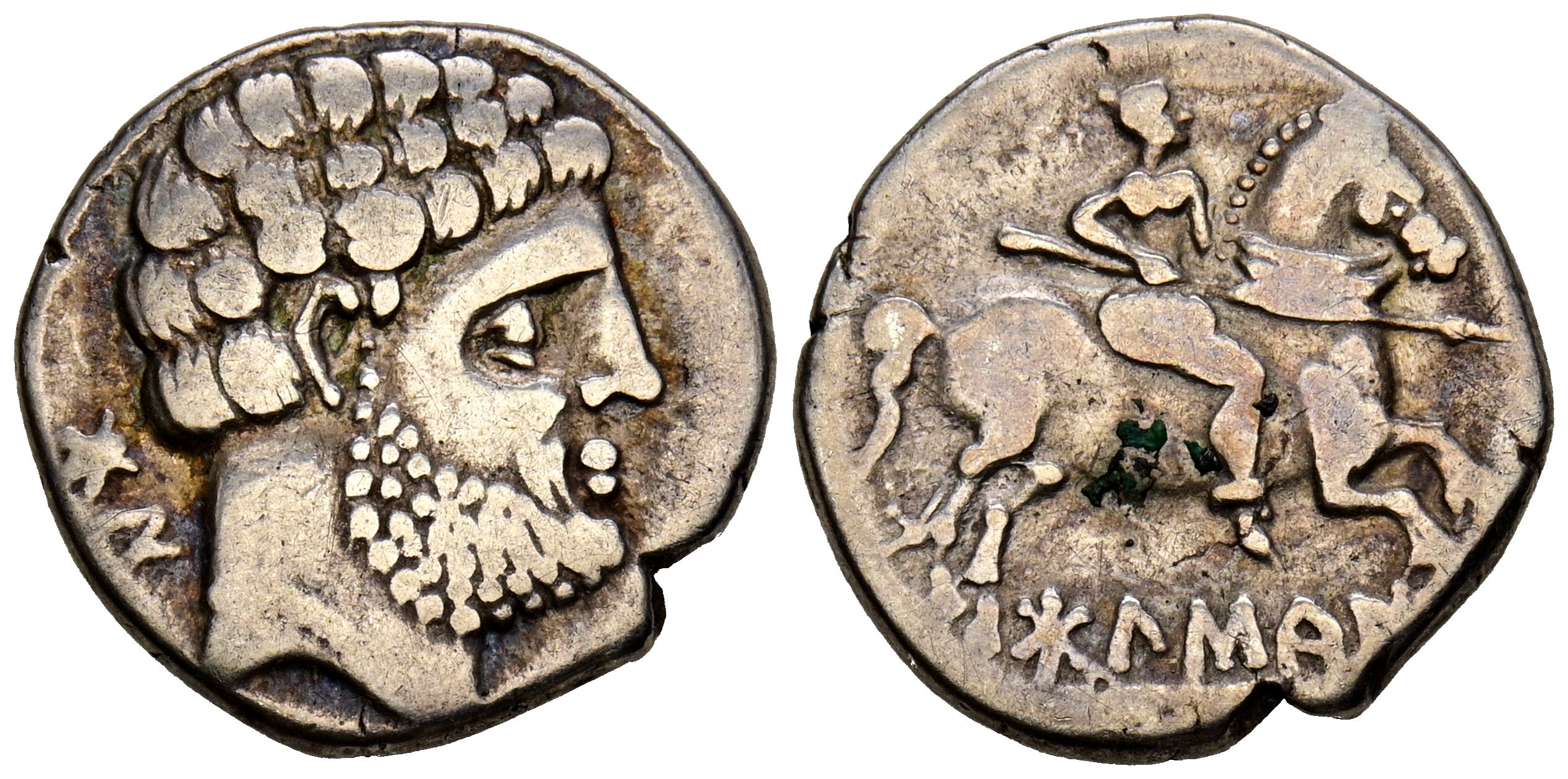 BOLSCAN (Huesca). Denario. (Ar. 3,88g/18mm). 180-20 a.C. (FAB-1911). Anv: Cabeza masculina barbada a derecha, detrás letras ibéricas: BoN. Rev: Jinete con lanza a derecha, debajo leyenda ibérica: BoLSCaN. MBC-.