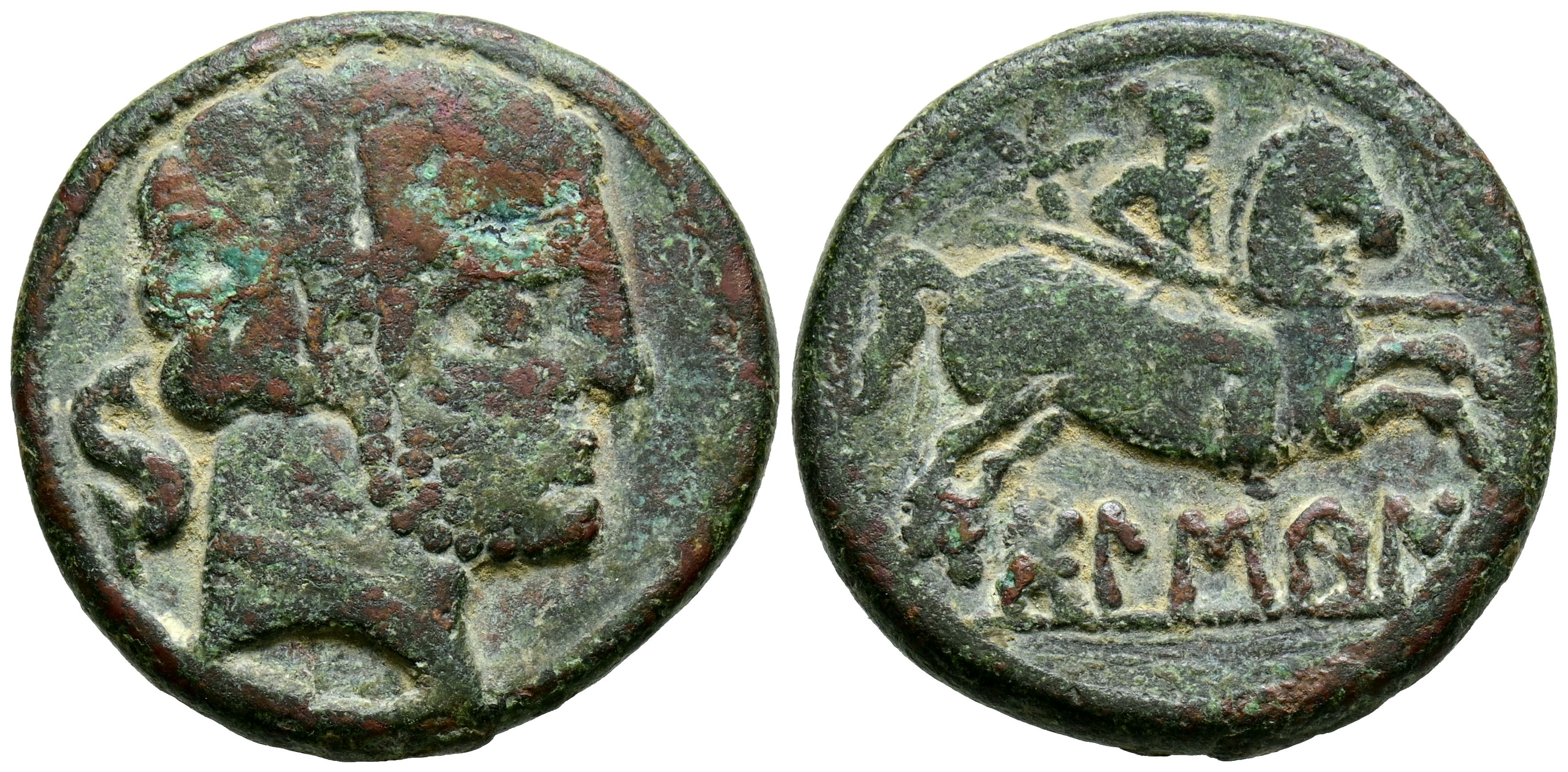BOLSCAN (Huesca). As. (Ae. 8,86g/24mm). 180-20 a.C. (FAB-1918). Anv: Cabeza barbada masculina a derecha, detrás delfín. Rev: Jinete con lanza a derecha, encima estrella, debajo leyenda ibérica: BoLSCaN. MBC-.