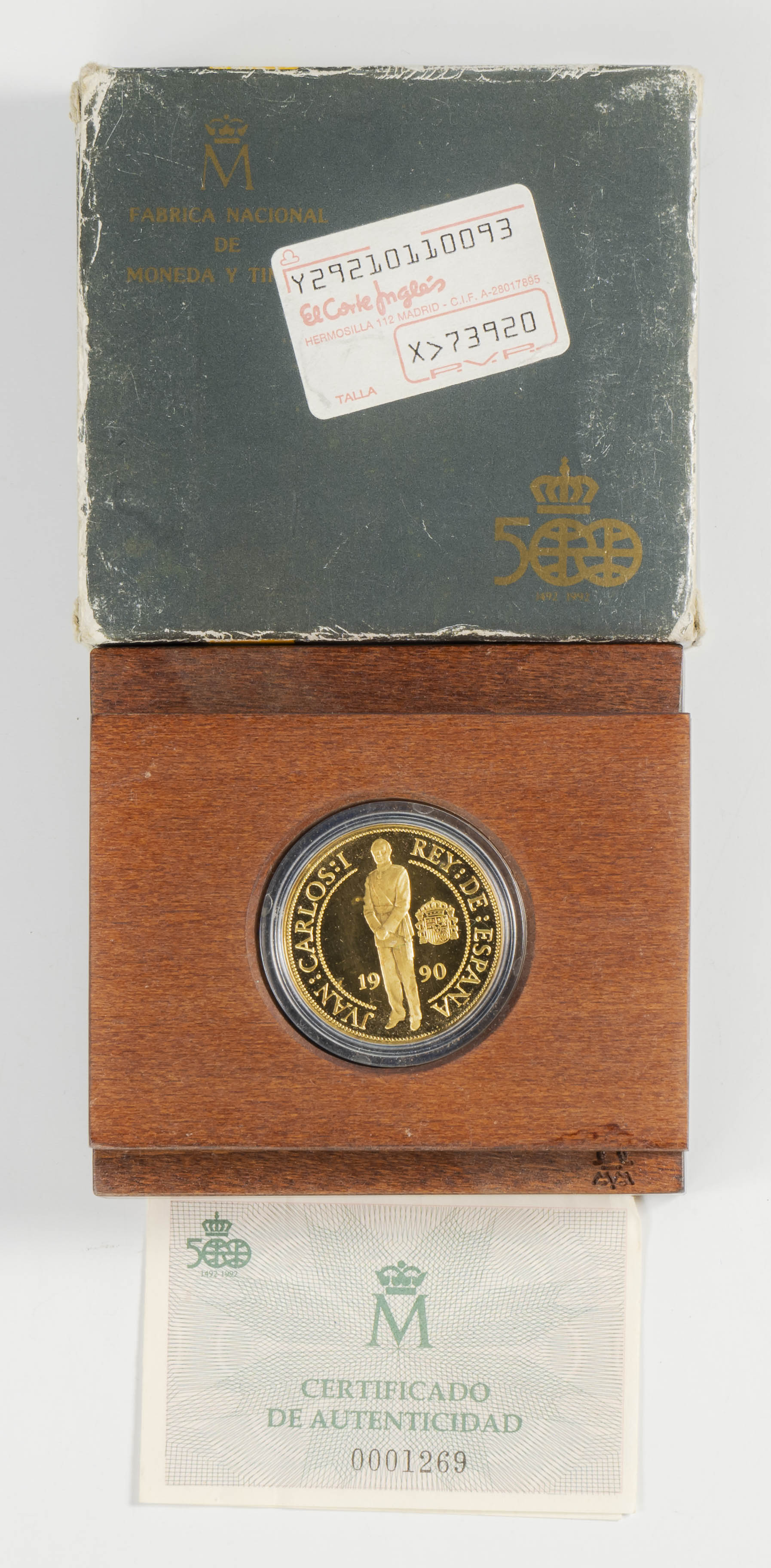 JUAN CARLOS I (1975-2014). 40.000 Pesetas. (Au. 13,50g/30mm). Quinto Centenario. Serie II. 1990. FNMT. PROOF. Presentada en estuche oficial (cartón deteriorado) y con certificado de autenticidad.