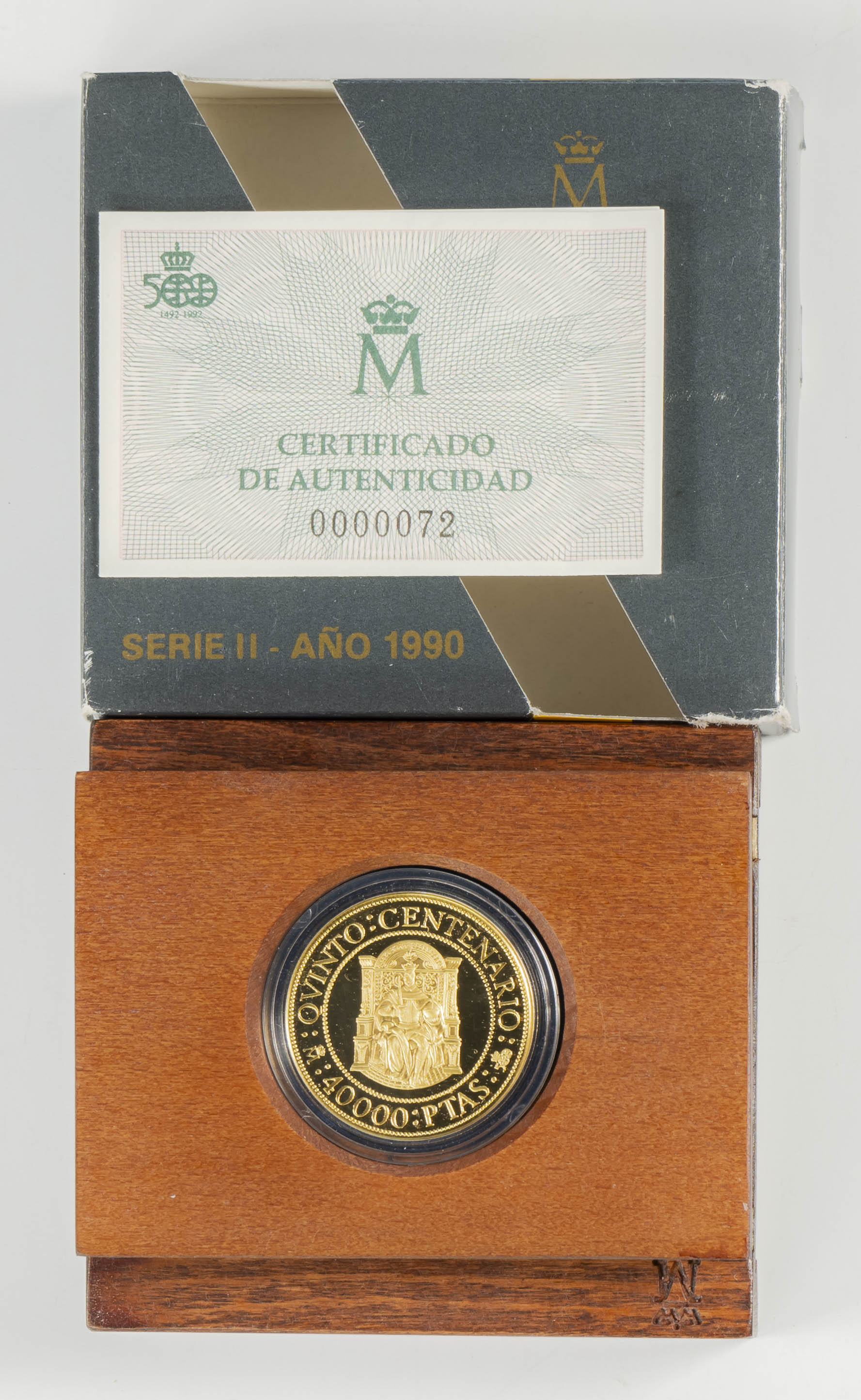 JUAN CARLOS I (1975-2014). 40.000 Pesetas. (Au. 13,50g/30mm). Quinto Centenario. Serie II. 1990. FNMT. PROOF. Presentada en estuche oficial (cajita de cartón deteriorada) y con certificado de autenticidad.