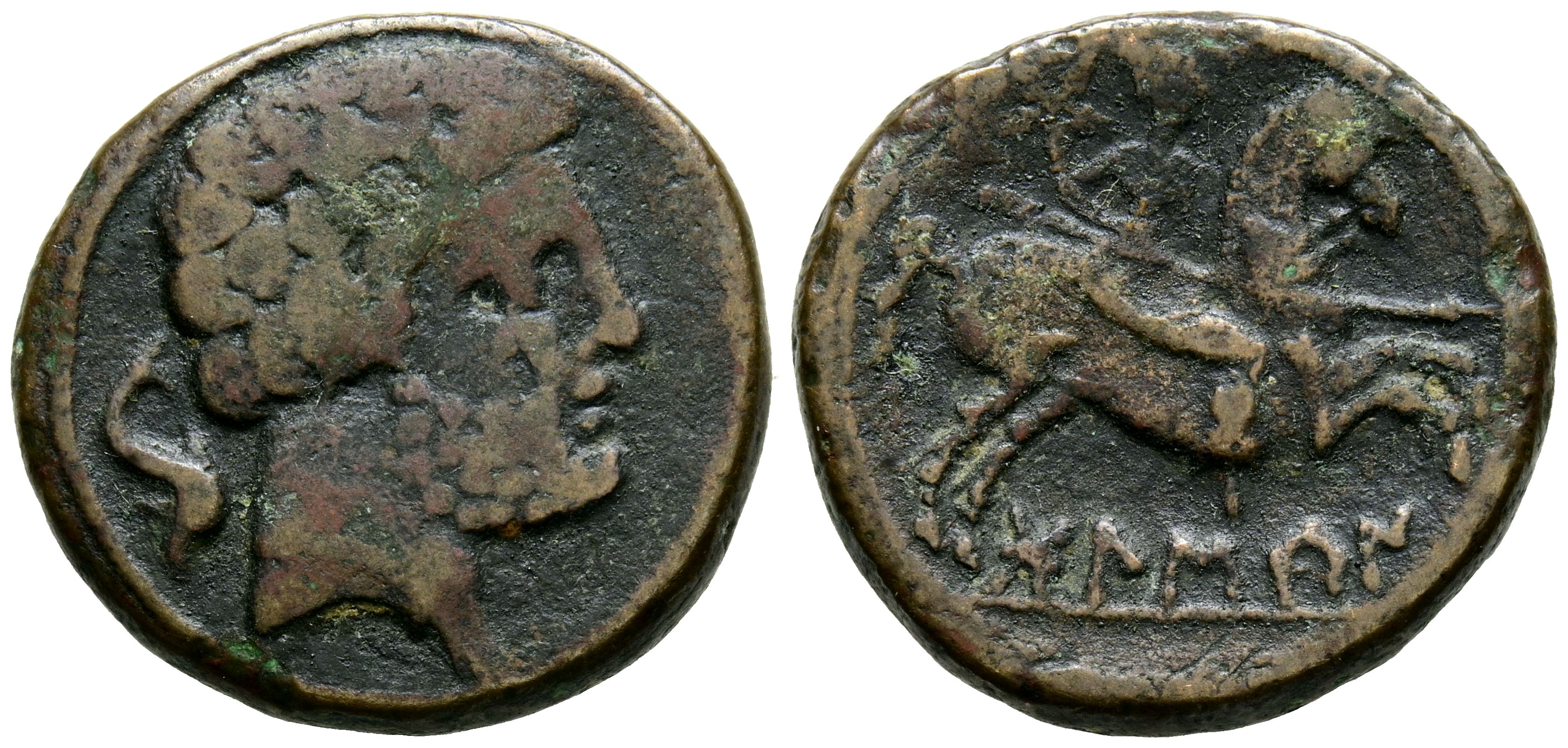 BOLSCAN (Huesca). As. (Ae. 8.57g/24mm). 180-20 a.C. (FAB-1918). Anv: Cabeza masculina barbada a derecha, detrás delfín. Rev: Jinete con lanza a la derecha, encima de la estrella, abajo leyenda ibérica: BoLSCaN. MBC-. Limpiada.