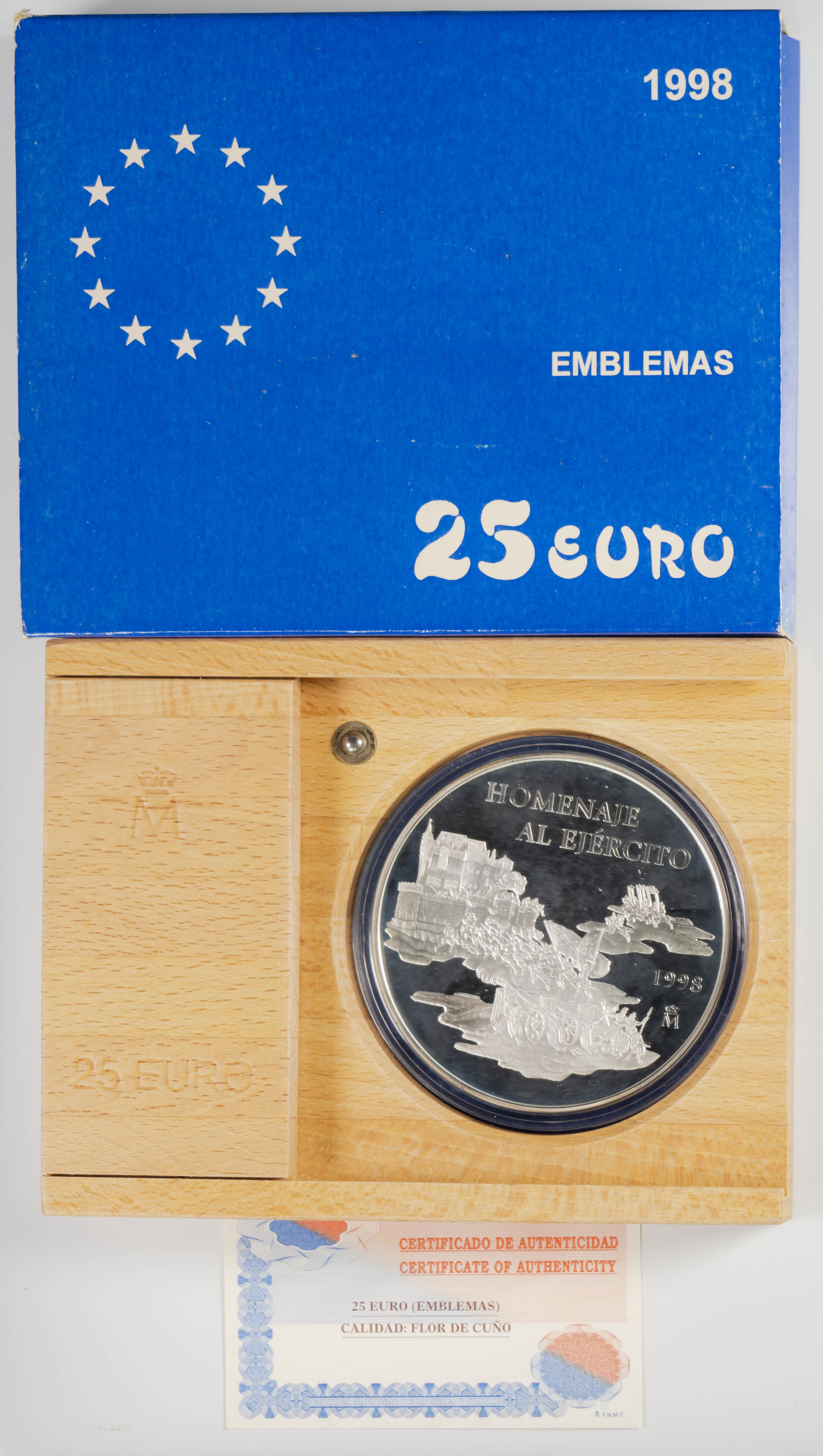 JUAN CARLOS I (1975-2014). 25 Euro. (Ar. 168,75g/73mm). Emblemas. 1998. FNMT. FDC. Presentada en estuche oficial y con certificado de autenticidad. Sólo 10 mil unidades emitidas.