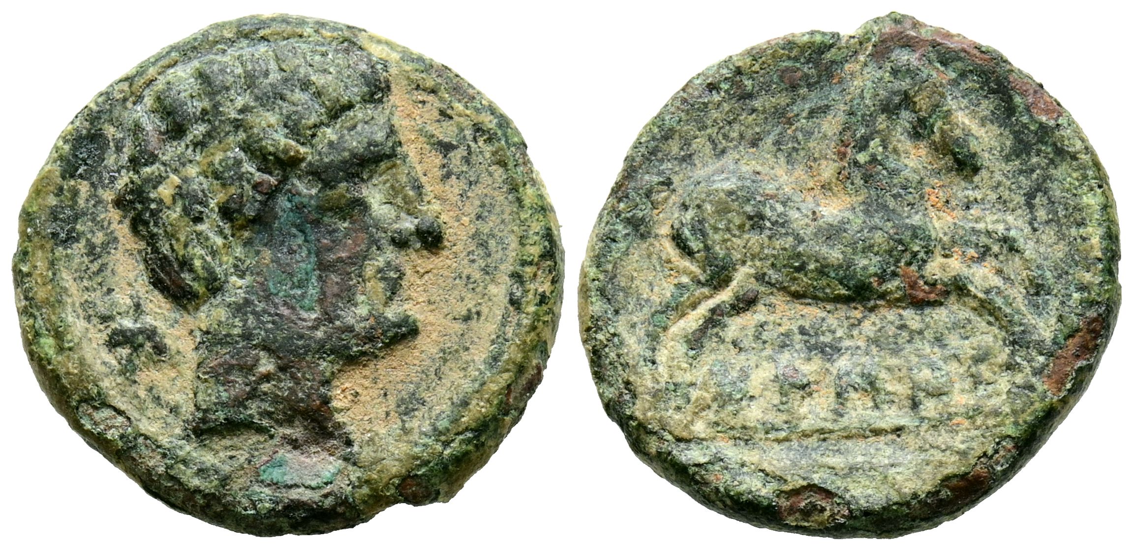 BOLSCAN (Huesca, Aragón). Cuadrante. (Ae. 2,90g/16mm). 180-20 a.C. (FAB-1922). Anv: Cabeza diademada a derecha, detrás letra ibérica Bo. Rev: Caballo saltando a derecha, encima tres puntos y debajo leyenda ibérica: BoLSCaN. MBC-.