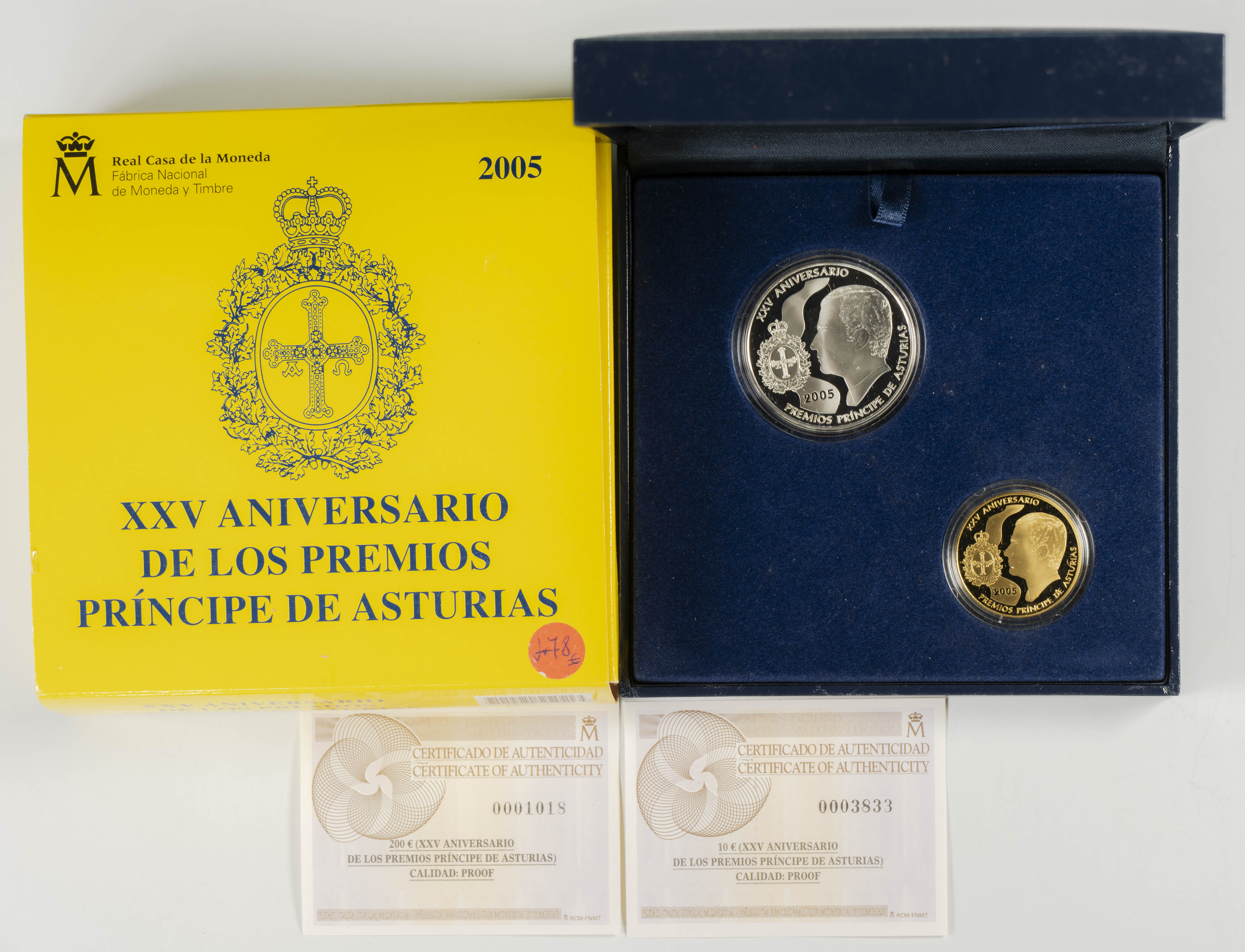 JUAN CARLOS I (1975-2014). XX Aniversario de los Premios Príncipe de Asturias. Serie completa en oro y plata. 2005. FNMT. Incluye 2 monedas, 1 de 10€ en plata y 1 de 200€ en oro. Calidades PROOF. Incluye estuche original y certificados de autenticidad.