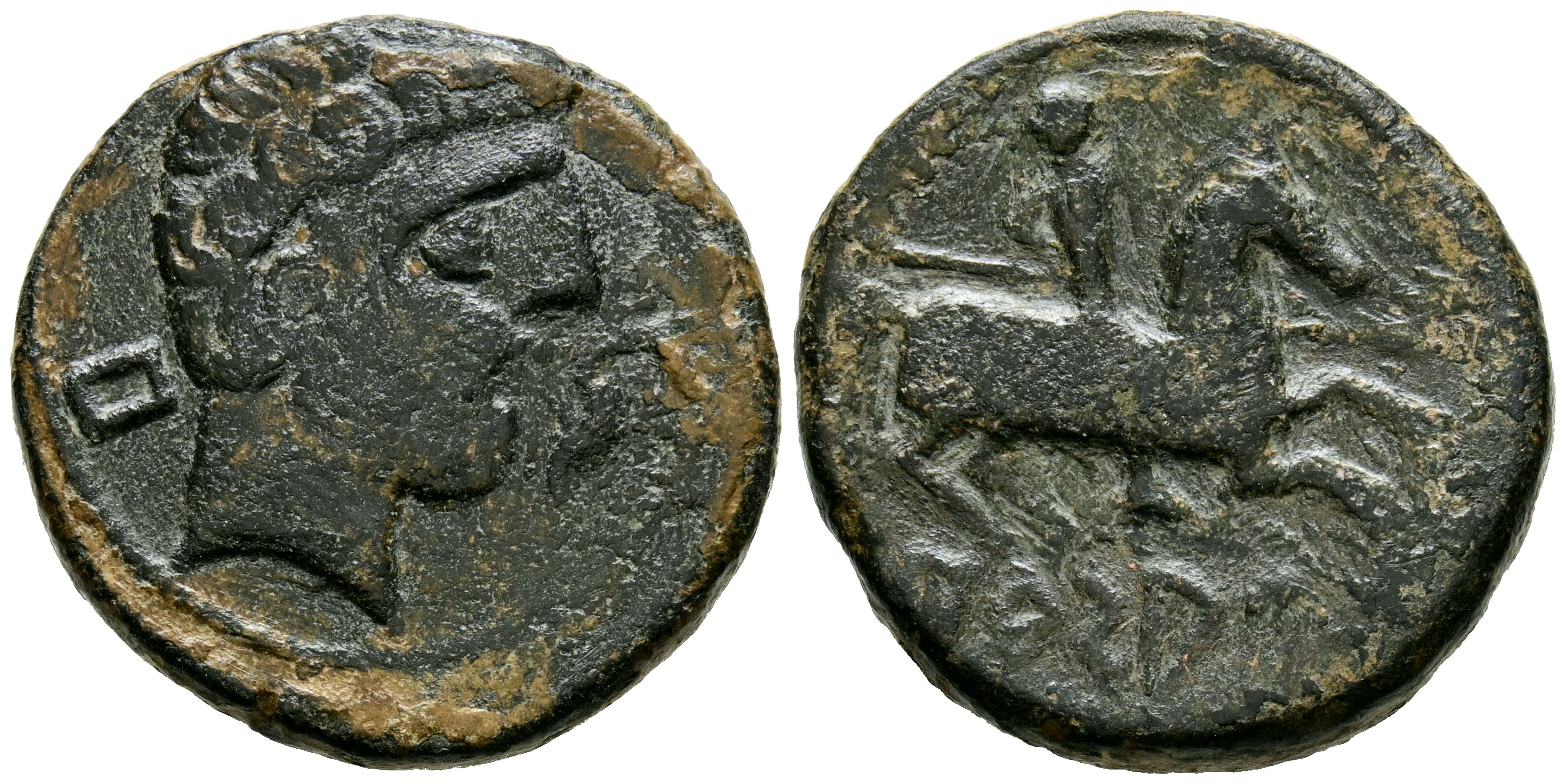 BURSAU (Borja, Zaragoza). As. (Ae. 11,54g/25mm). 120-80 a.C. (FAB-298). Anv: Cabeza masculina barbada a derecha, detrás letra: Bu, delante delfín. Rev: Jinete con lanza a derecha, encima creciente, debajo leyenda ibérica: BuRSAU. MBC-.
