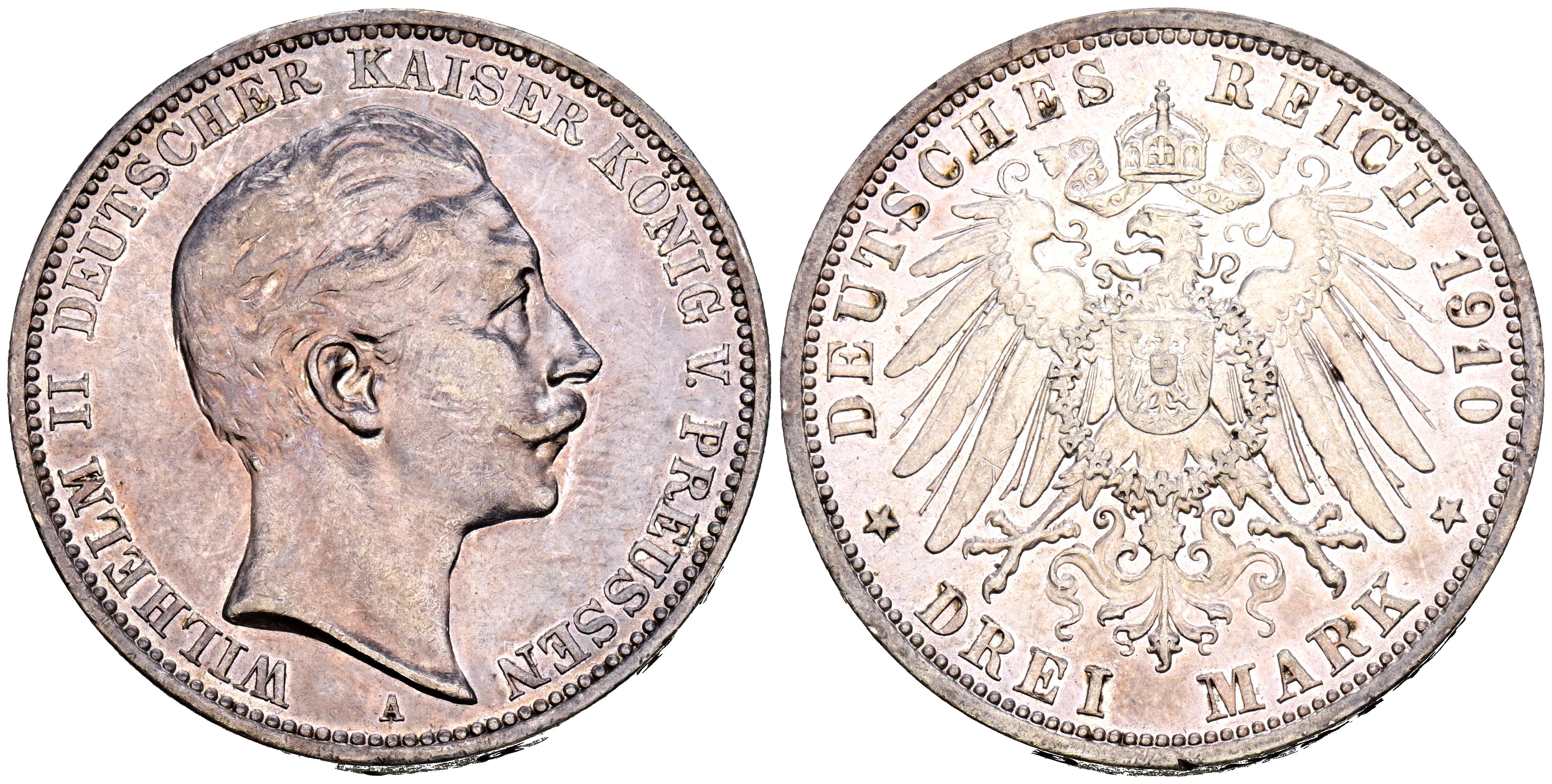 ALEMANIA, Wilhelm II. 3 Mark. (Ar. 16,63g/33mm). 1910. Berlín A. (Km# 527). EBC-. Preciosa pátina.