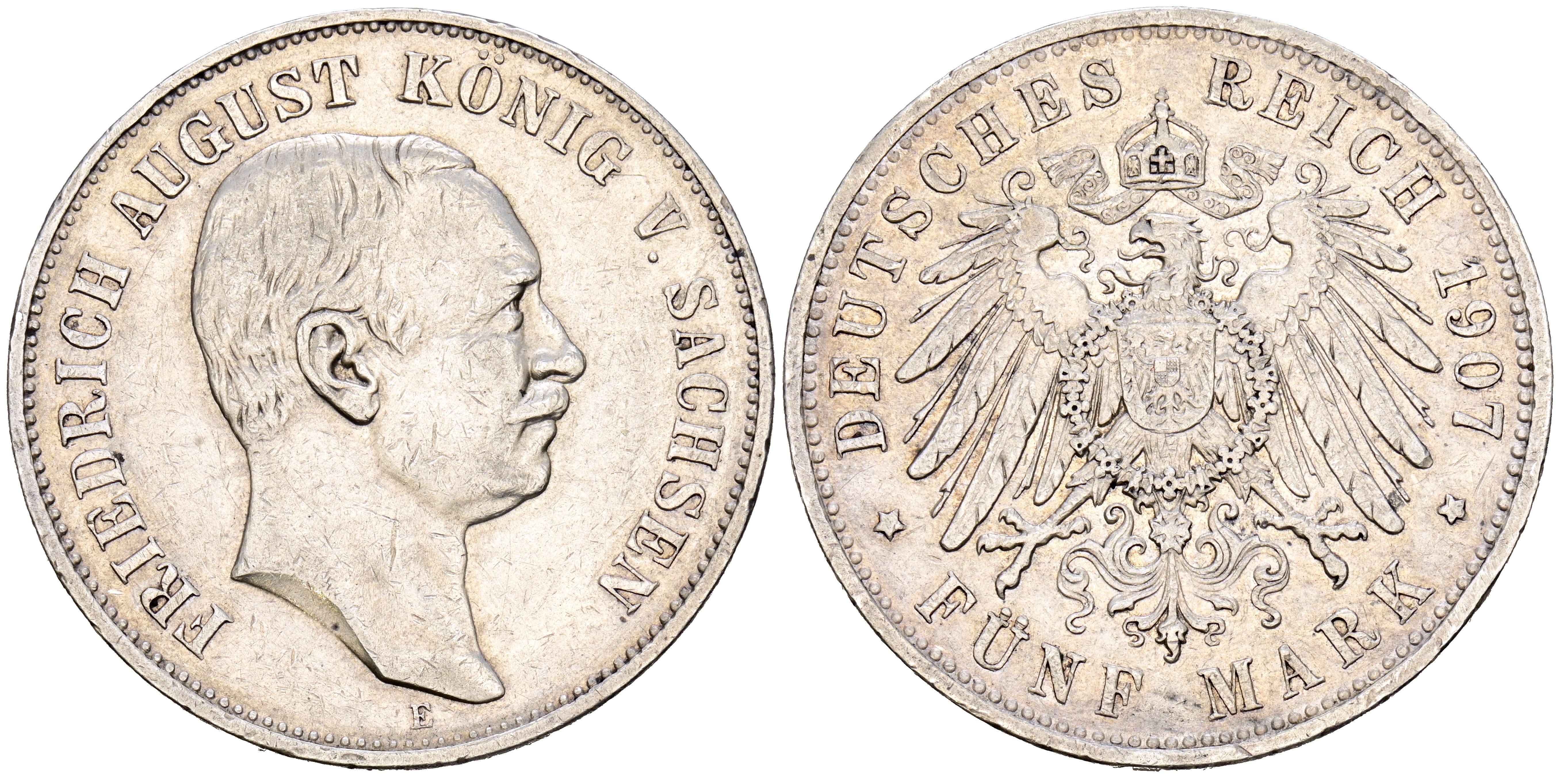 ALEMANIA, Federico Augusto III. 5 Mark. (Ar. 27,73g/38mm). 1907. Muldenhutten E. Sajonia. (Km#1266). MBC.