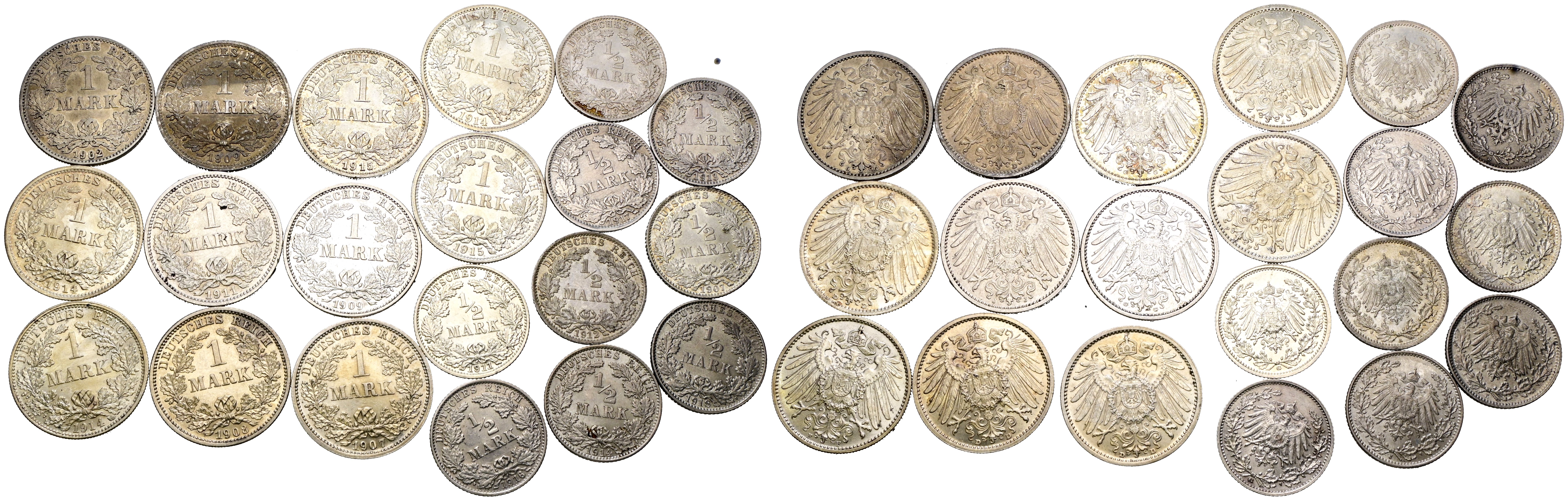 ALEMANIA. Extraordinario conjunto de 20 piezas con valores de 1/2 y 1 Mark acuñados en el Imperio Alemán entre 1902 y 1918 con gran variedad de cecas. Ninguna pieza repetida. El conjunto destaca por la alta calidad en las conservaciones de todas las piezas, incluyendo ejemplares en SC y muchas de ellas con brillo original y preciosas pátinas. A EXAMINAR.