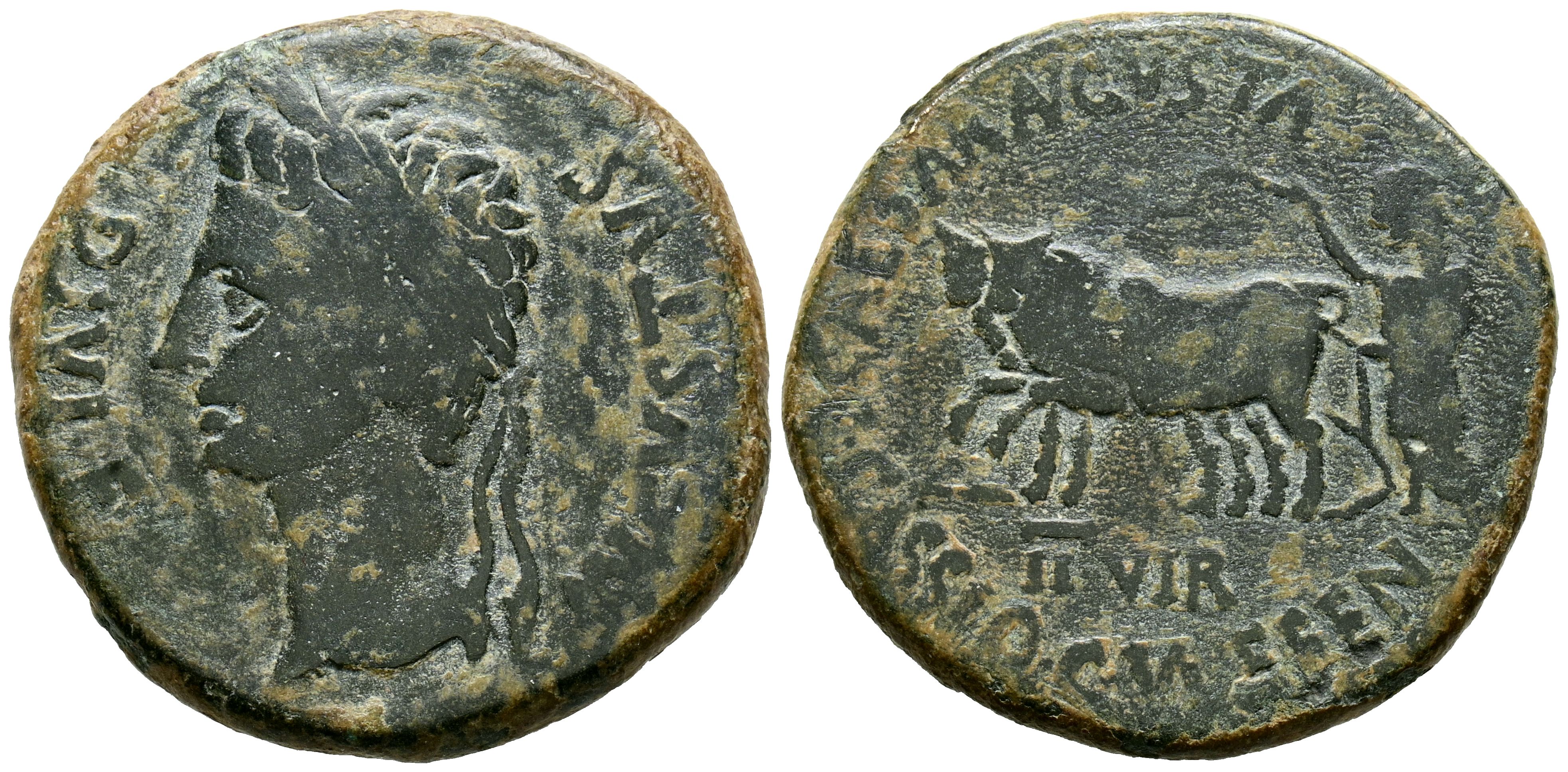 CAESAR AUGUSTA. As. (Ae. 12,32g/28mm). 27 a.C. a 14 d.C. Zaragoza. (FAB-318). Anv: Cabeza laureada de Augusto a izquierda, alrededor leyenda: DIVI F AVGVSTVS. Rev: Yunta a izquierda, debajo: II VIR, y alrededor leyenda: CAESAR AVGVSTA L CASSIO C VALER FEN. MBC.