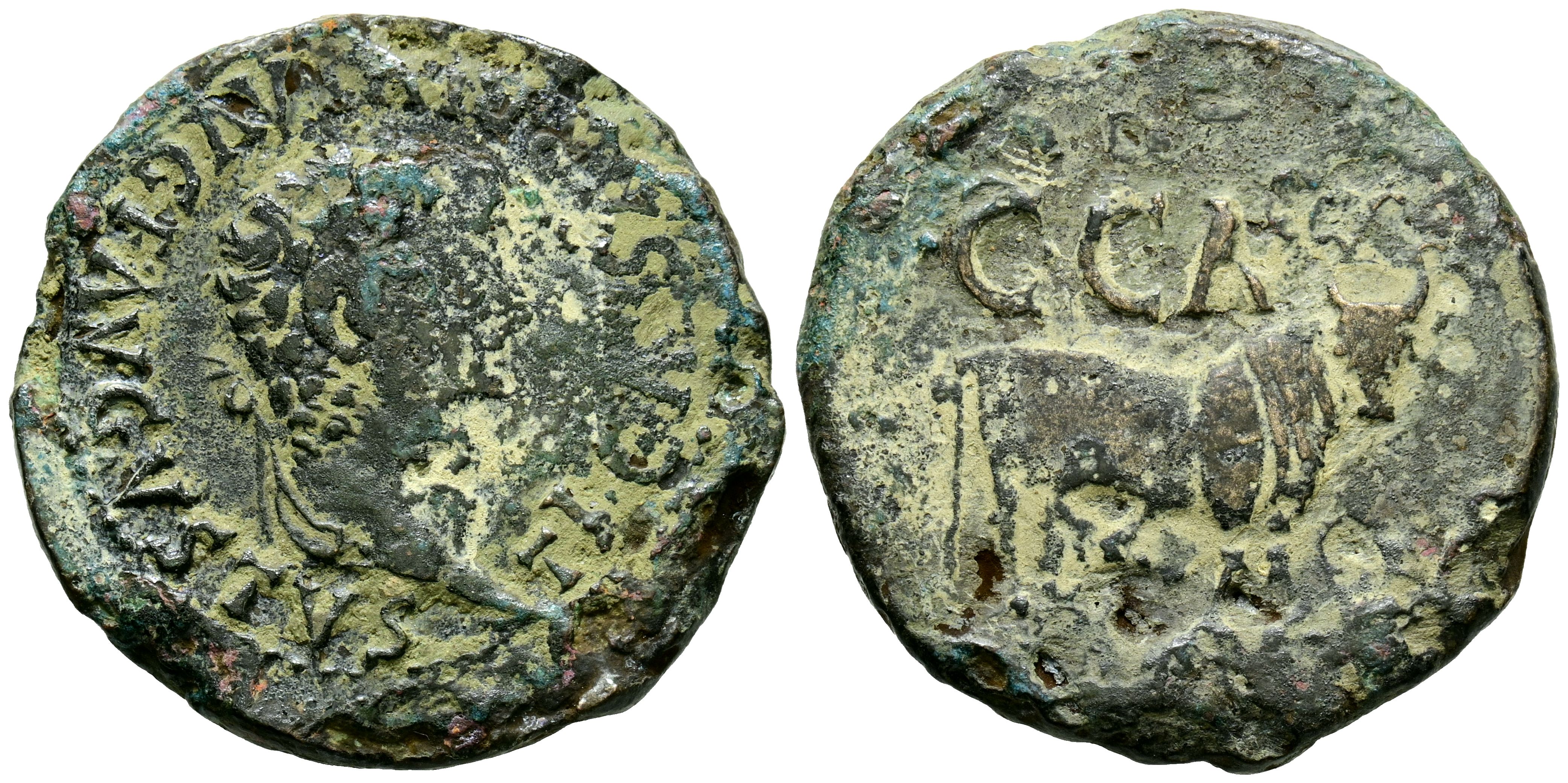 CAESARAUGUSTA (Zaragoza). As. (Ae. 13,05g/30mm). 27 a.C.-14 d.C. (FAB-367). Anv: Cabeza laureada de Augusto a derecha, alrededor leyenda: TI CAESAR DIVI AVG F AVGVSTVS. Rev: Toro a derecha sobre línea, encima leyenda: CCA. BC+.