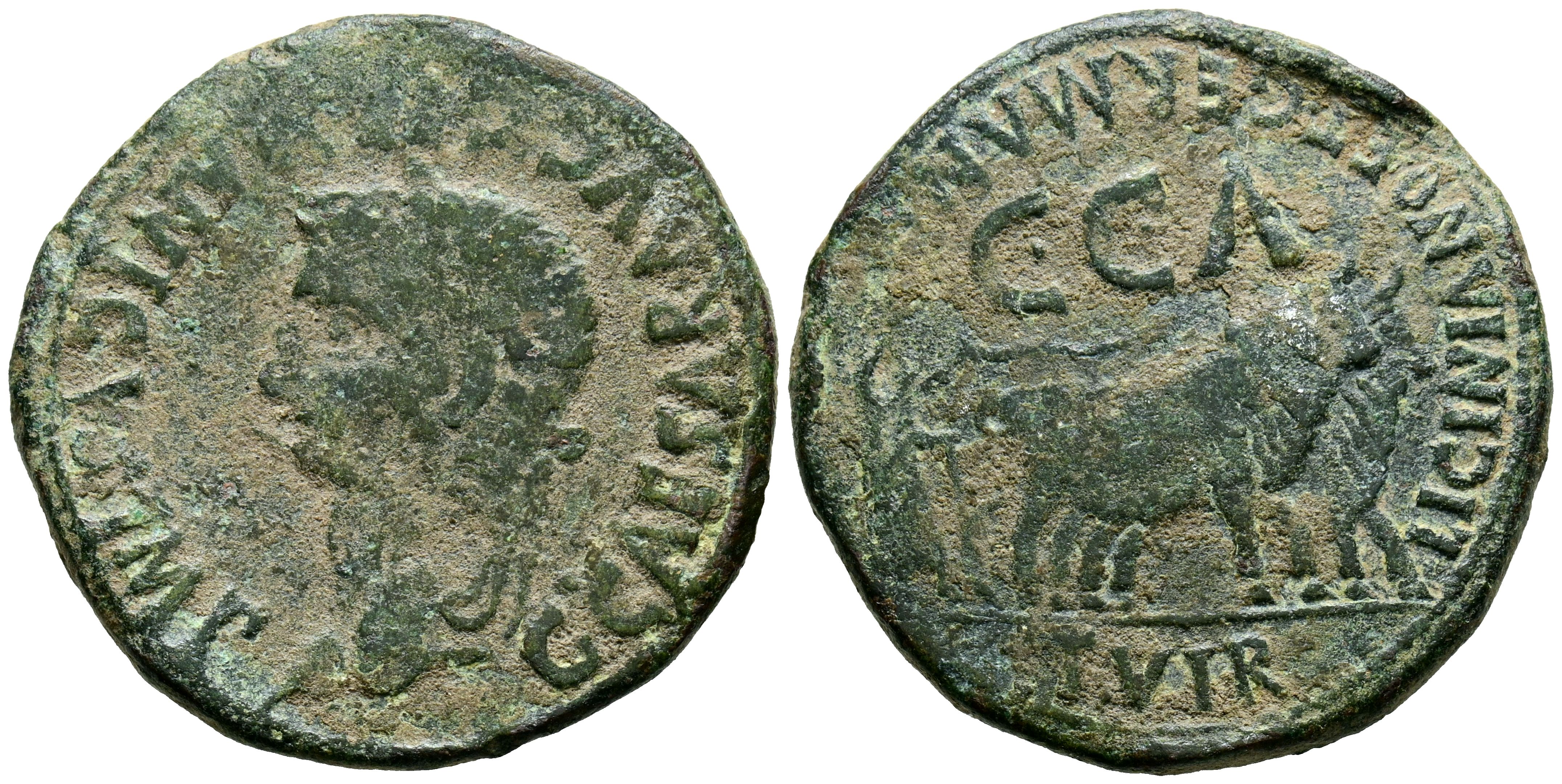CAESARAUGUSTA (Zaragoza). As. (Ae. 12,25g/30mm). (FAB-391) Anv: Cabeza de Calígula laureada a izquierda, alrededor leyenda: C CAESAR AVG GERMANICVS IMP. Rev: Yunta a derecha, encima: CCA, alrededor leyenda: LICINIANO ET GERMANICO II VIR. MBC.