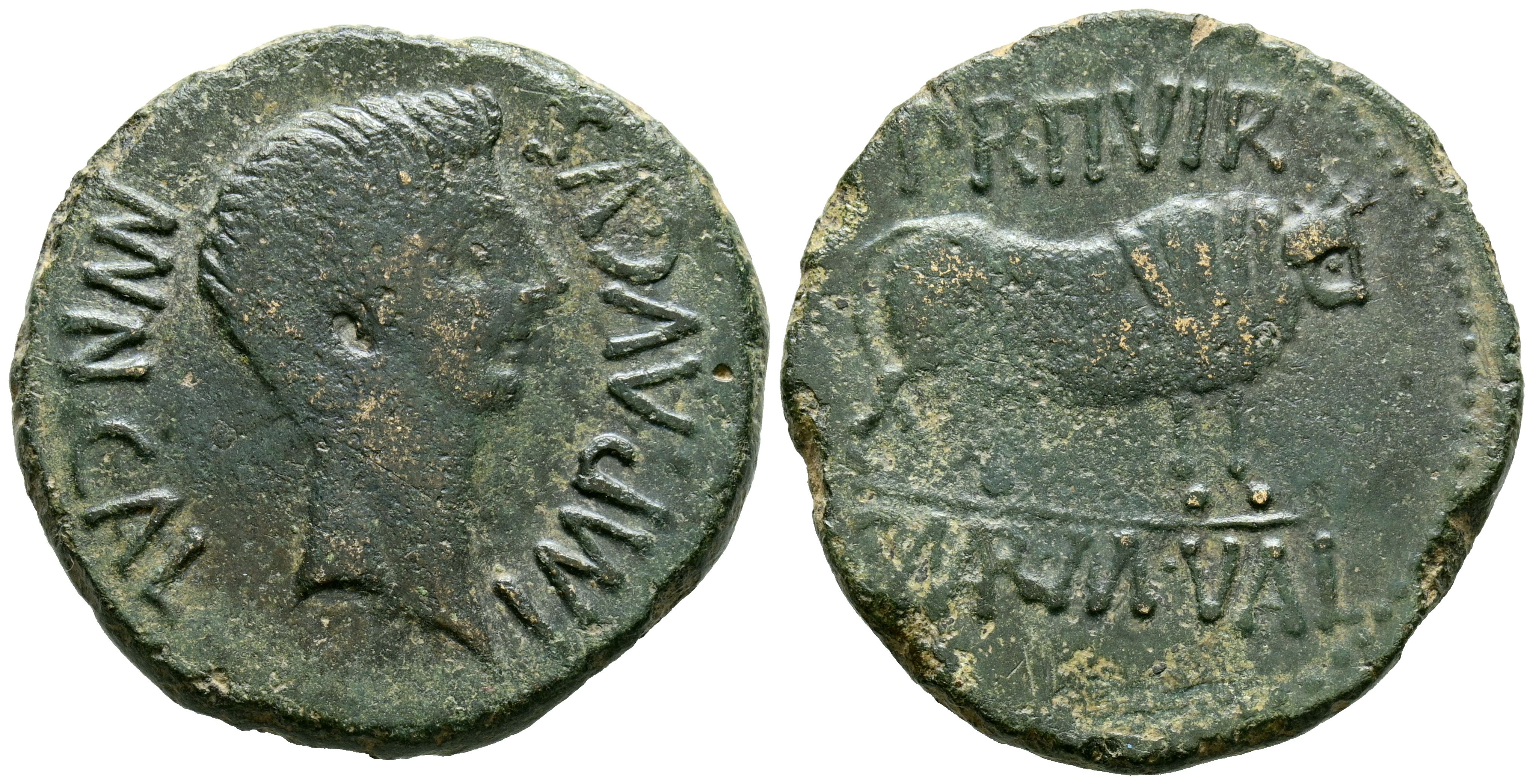 CALAGURRIS (Calahorra, La Rioja). As. (Ae. 11,99g/29mm). 27 a.C.-14 d.C. (FAB-414). Anv: Cabeza desnuda de Augusto a derecha, alrededor leyenda: MVN CALAG IMP AVGVSTVS. Rev: Toro a derecha, alrededor leyenda: PR II VIR C MAR M VAL. MBC+.