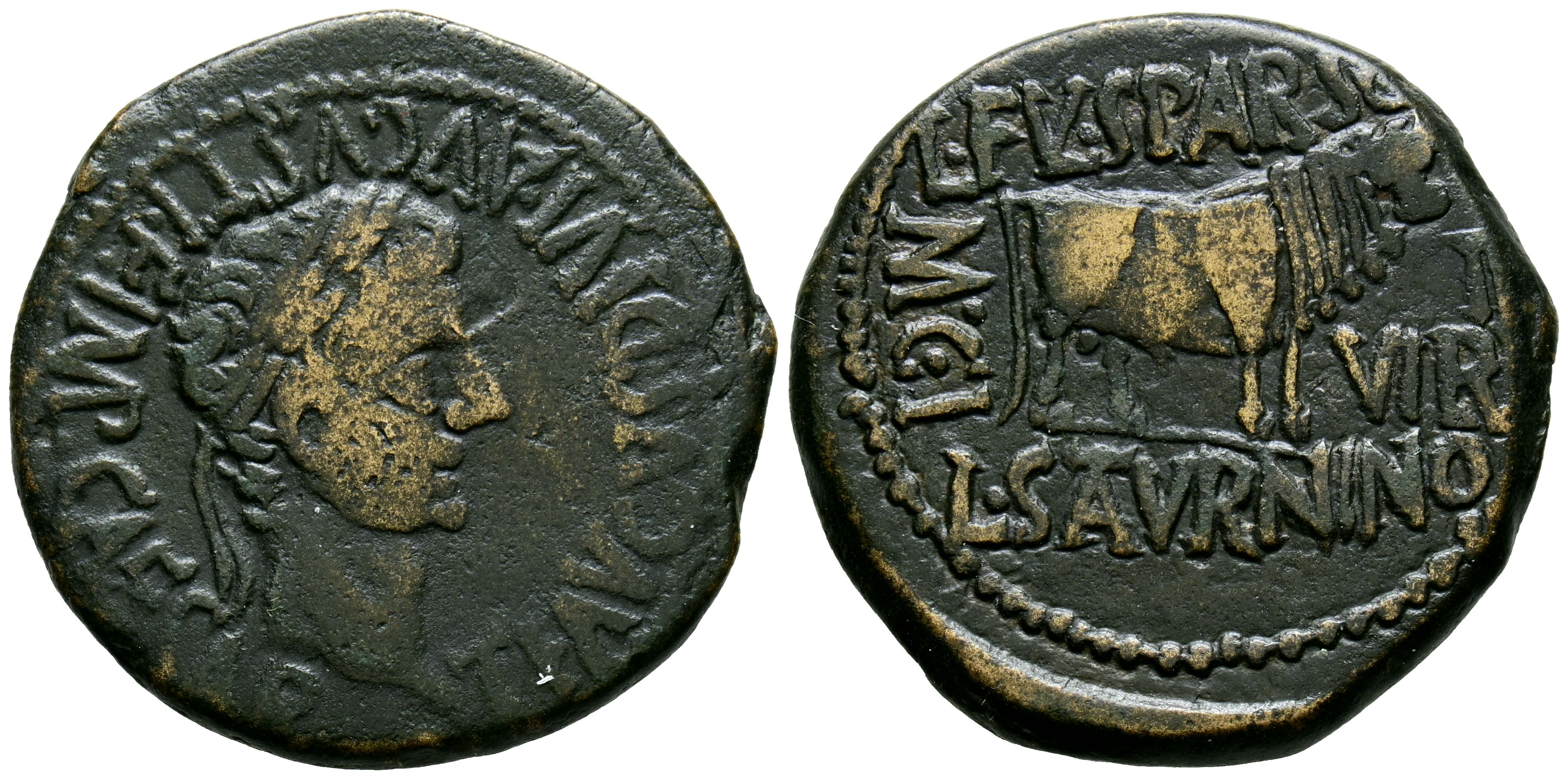 CALAGURRIS (Calahorra, La Rioja). As. (Ae. 10,61g/28mm). 14-36 d.C. (FAB-429). Anv: Cabeza laureada de Tiberio a derecha, alrededor leyenda: TI AVGVS DIVI AVGVSTI F IMP CAESAR. Rev: Toro a derecha, alrededor leyenda: L FVL SPARSO L SATVRNINO II VIR MCI. MBC-/MBC.