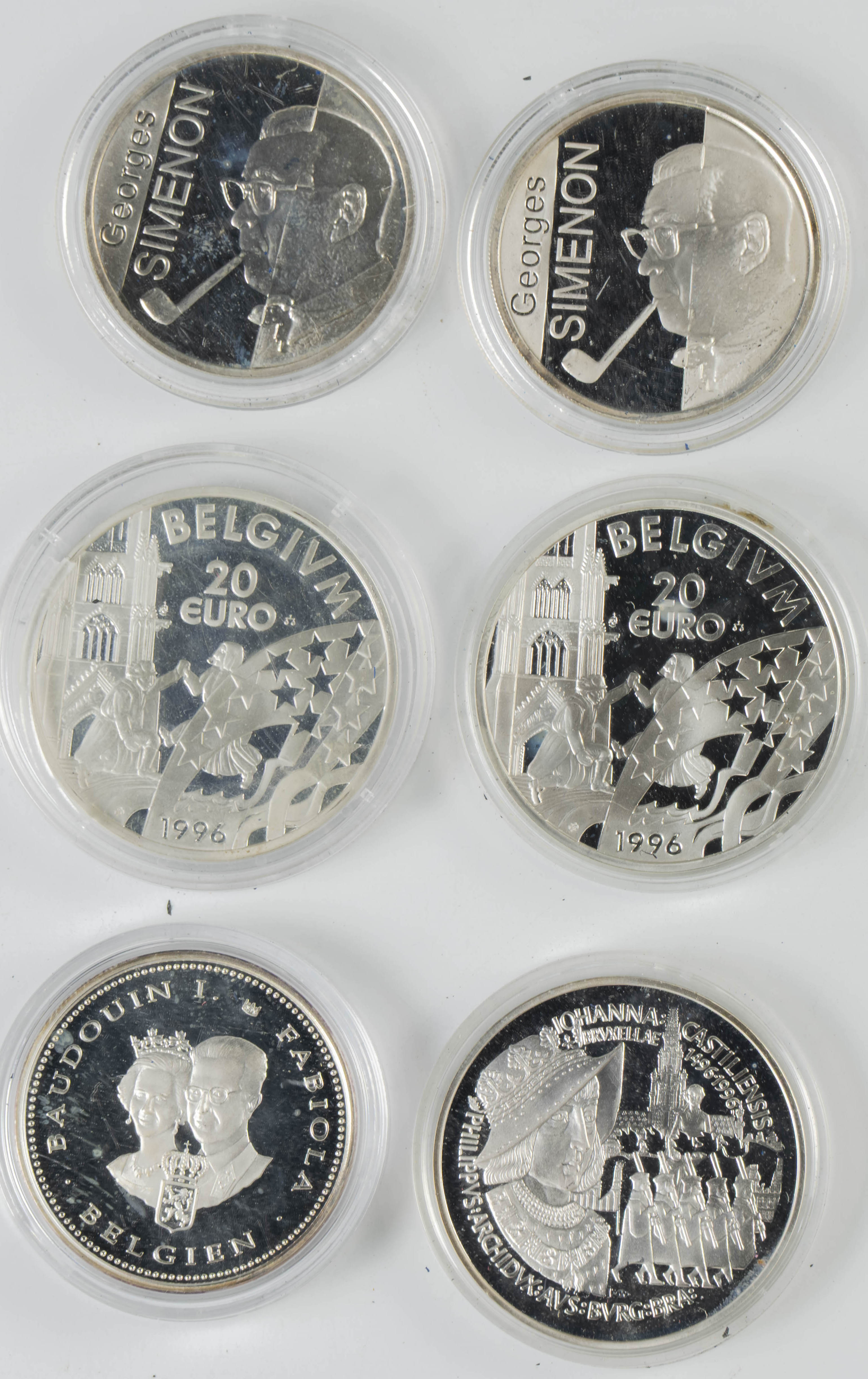 BÉLGICA. Conjunto de 12 monedas en plata presentadas en estuches, carteras y cápsulas. Módulos de 10 y 20 Euros. Temáticas diferentes. Terminaciones PROOF Y SC. A EXAMINAR.