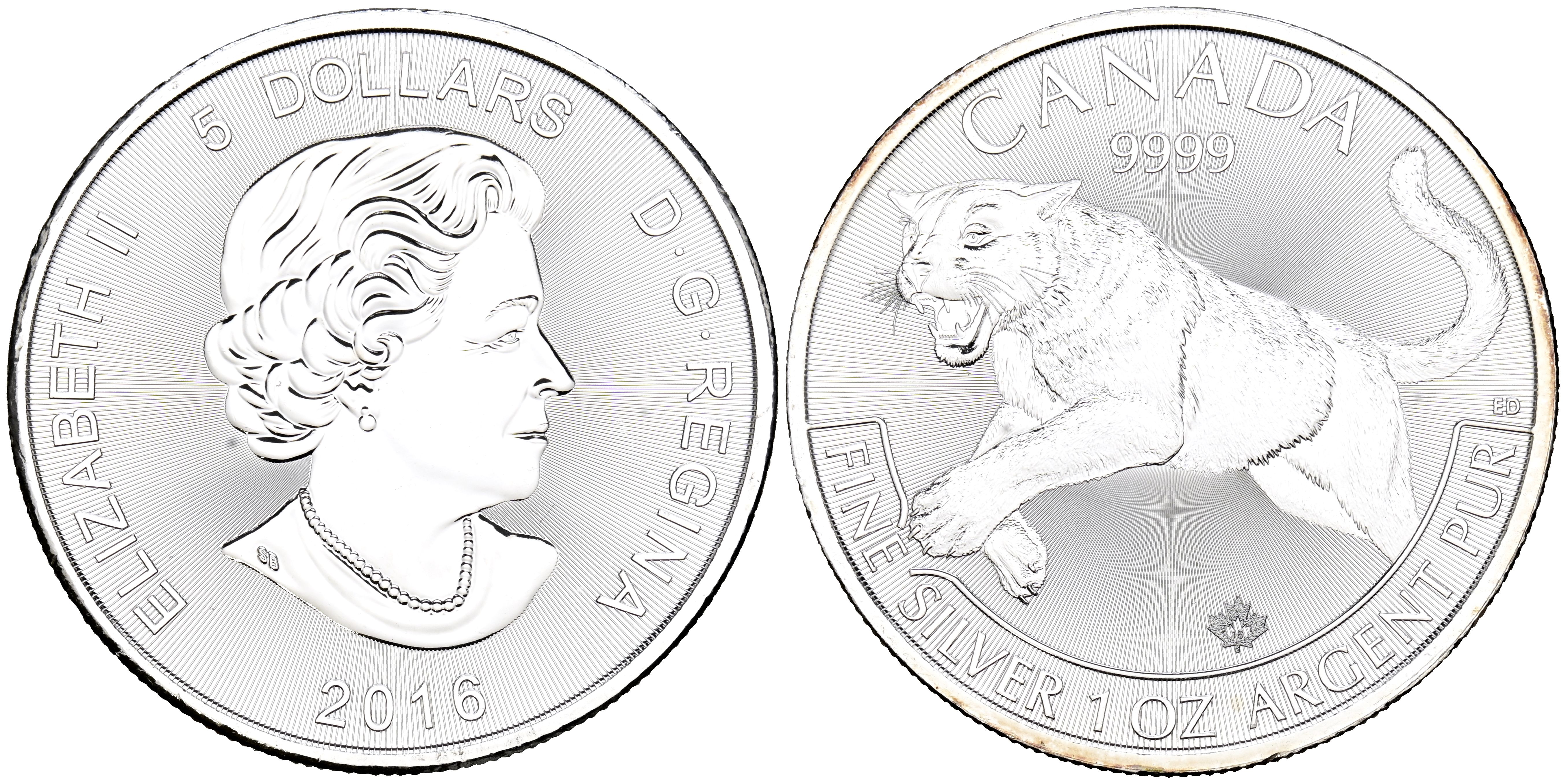 CANADÁ. 5 Dollars. (Ar. 31,12g/38mm). 2016. Serie Depredadores. Puma. 2016. (Km#247). Plata de 0,999 milésimas. SC.