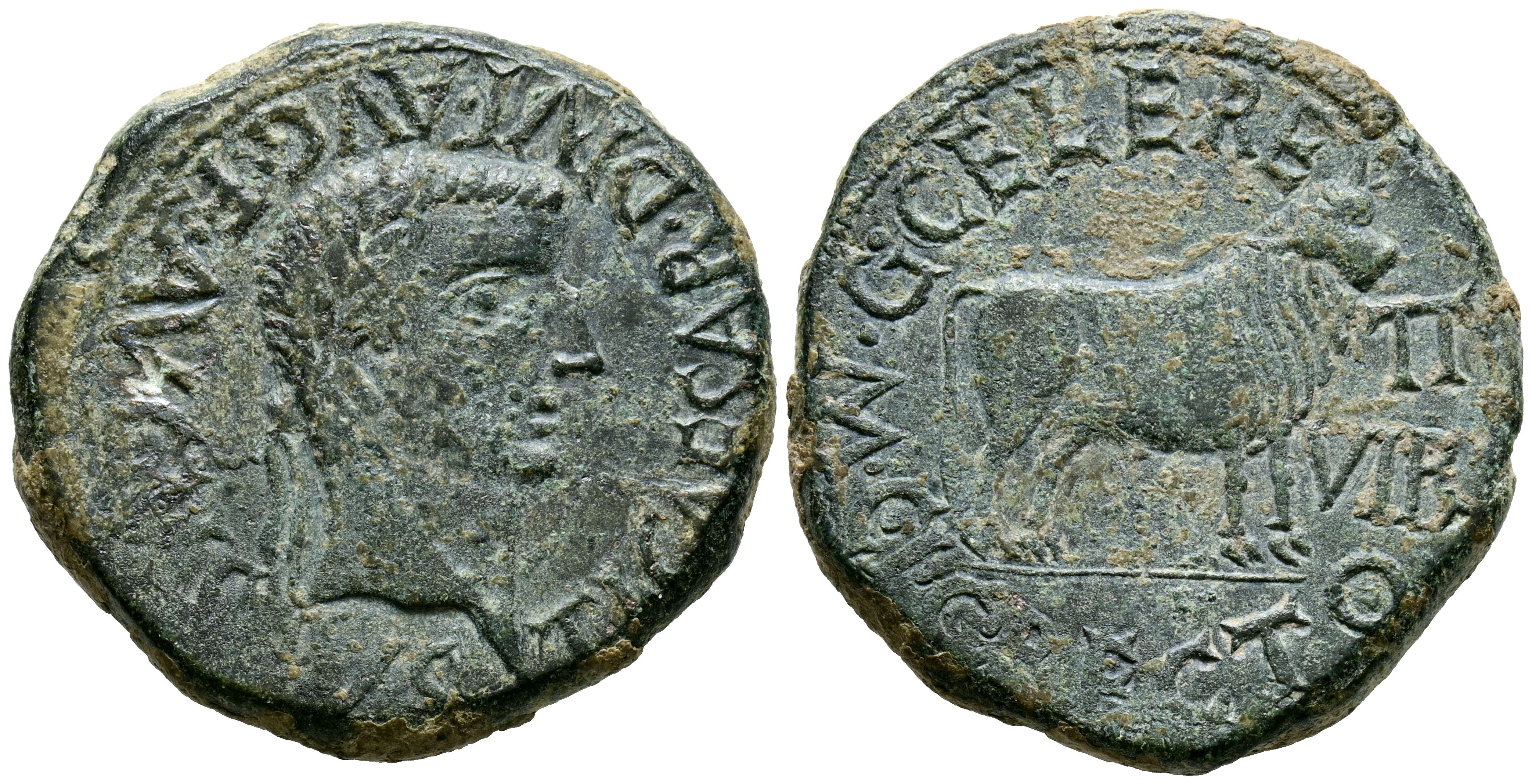 CALAGURRIS (Calahorra, La Rioja). As. (Ae. 15,82g/30mm). 14-36 d.C. (FAB-430). Anv: Cabeza laureada de Tiberio a derecha, alrededor leyenda: TI CAESAR DIVI AVG F AVGVSTVS. Rev: Toro a derecha, alrededor leyenda: G CELERE G RECTO II VIR MCI. MBC.