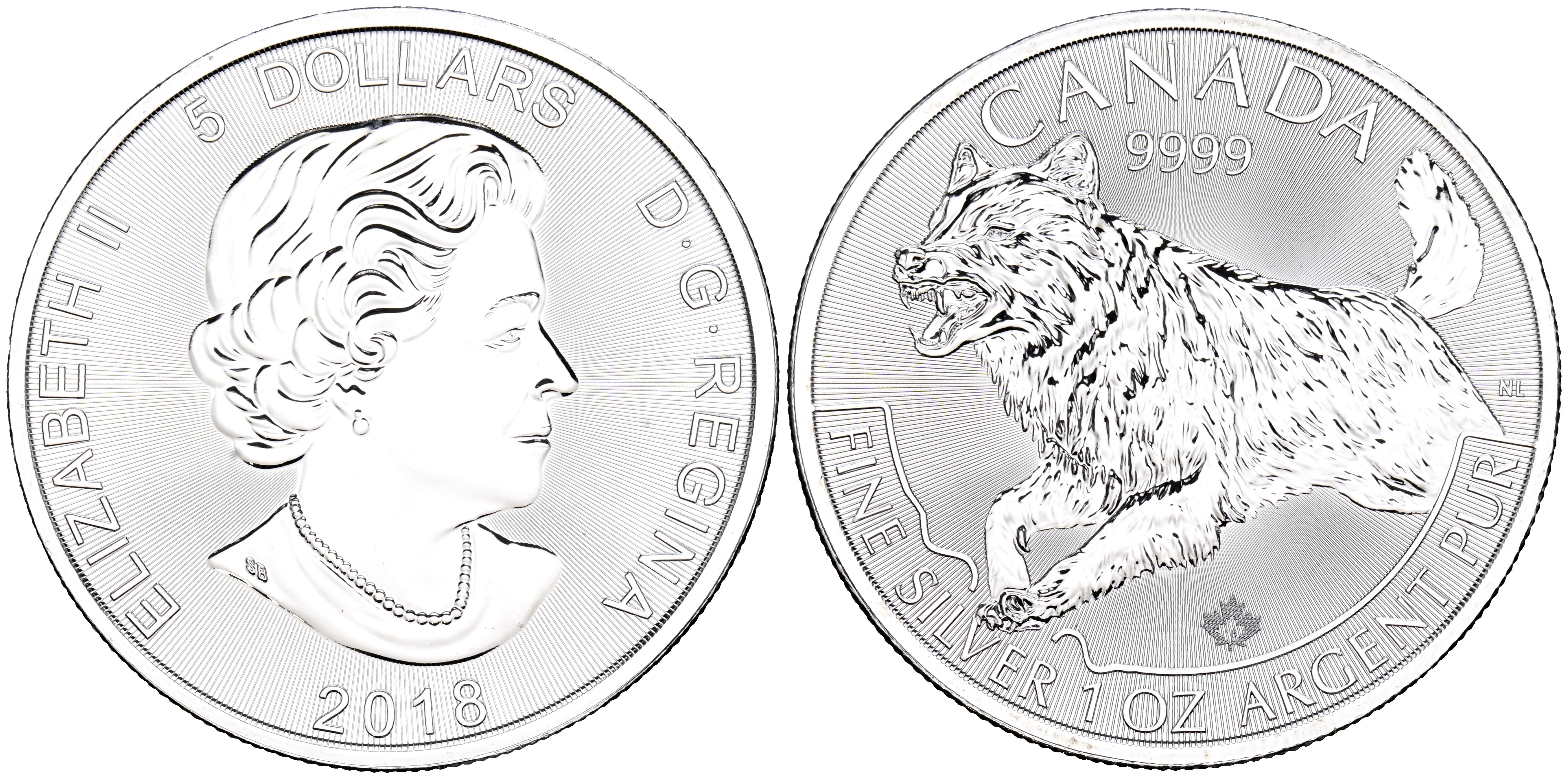 CANADÁ. 5 Dollars. (Ar. 31,12g/38mm). 2018. Serie Depredadores. Lobo. 2017. (Km#276). Plata de 0,999 milésimas. SC.