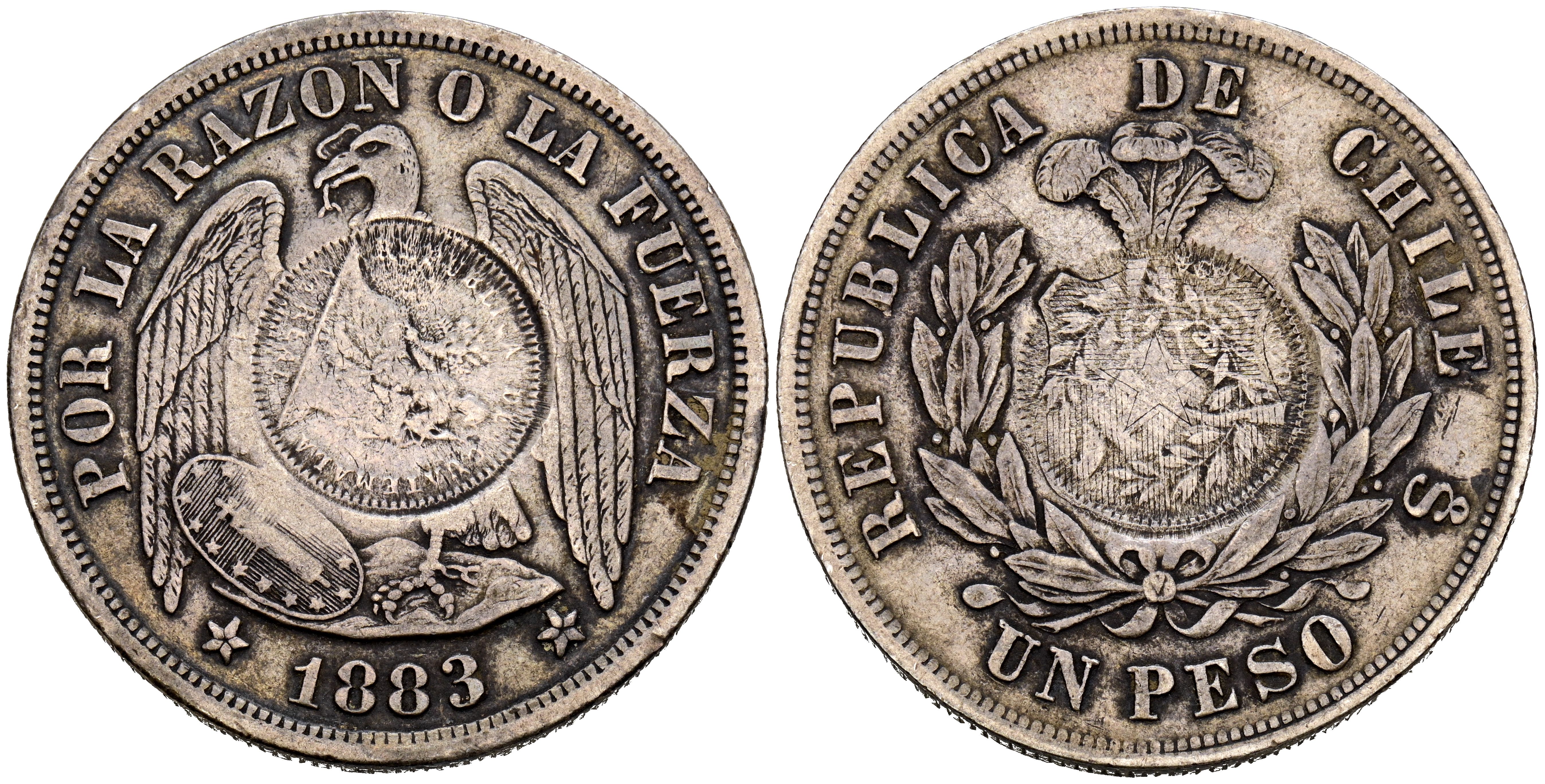 CHILE. 1 Peso. (Ar. 25,01g/38mm). 1883. Santiago. (Km#142.1). Resello de Guatemala de 1/2 Real. 1894. (Km#216). MBC. Resello A EXAMINAR.
