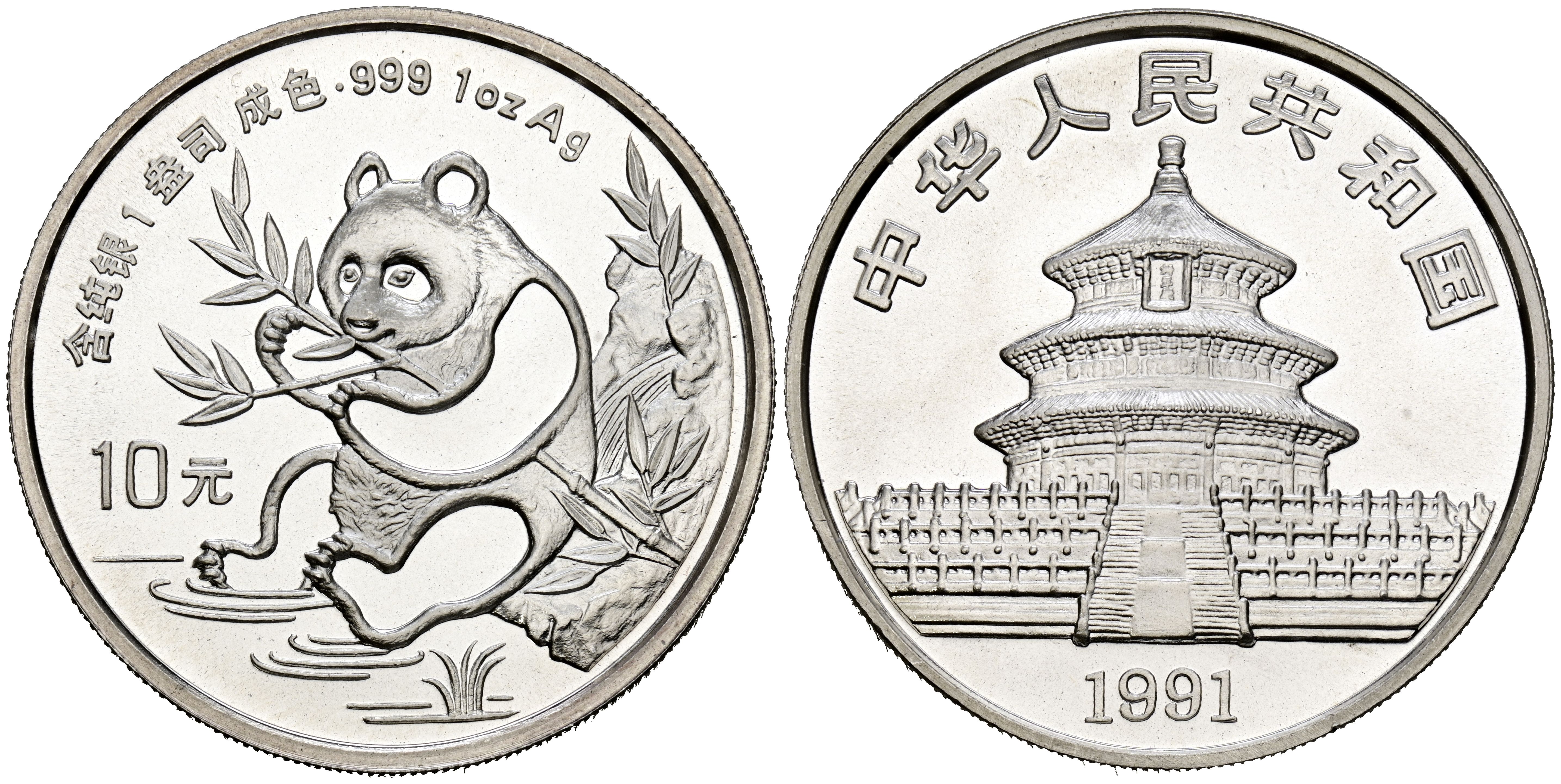 CHINA. 10 Yuan. (Ar. 31,14g/40mm). 1991. Serie Panda. (Km#352). Sin marca de ceca. SC.