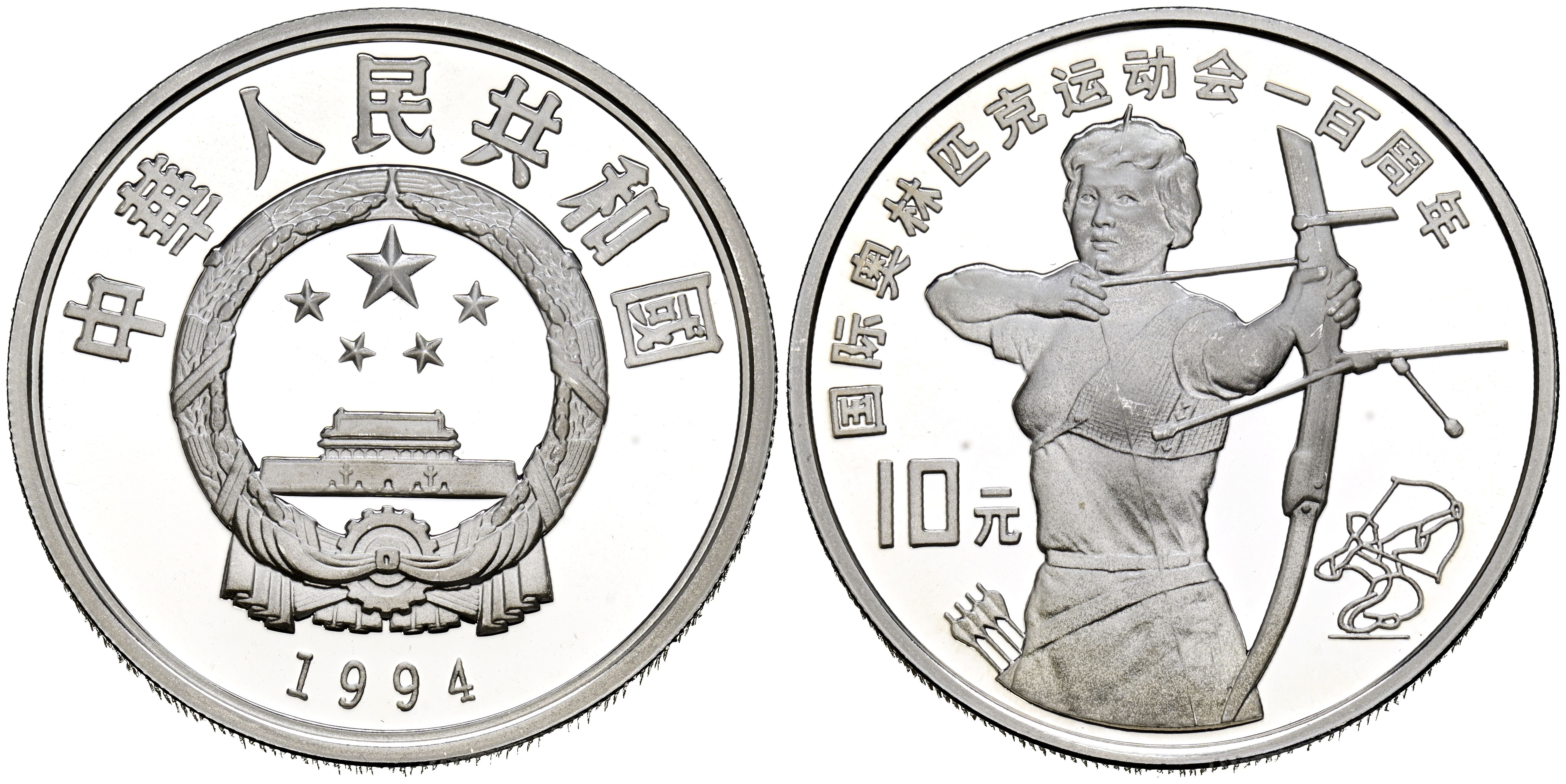 CHINA. 10 Yuan. (Ar. 29,94g/39mm). 1994. Juegos Olímpicos. Tiro con arco. (Km#526). PROOF.