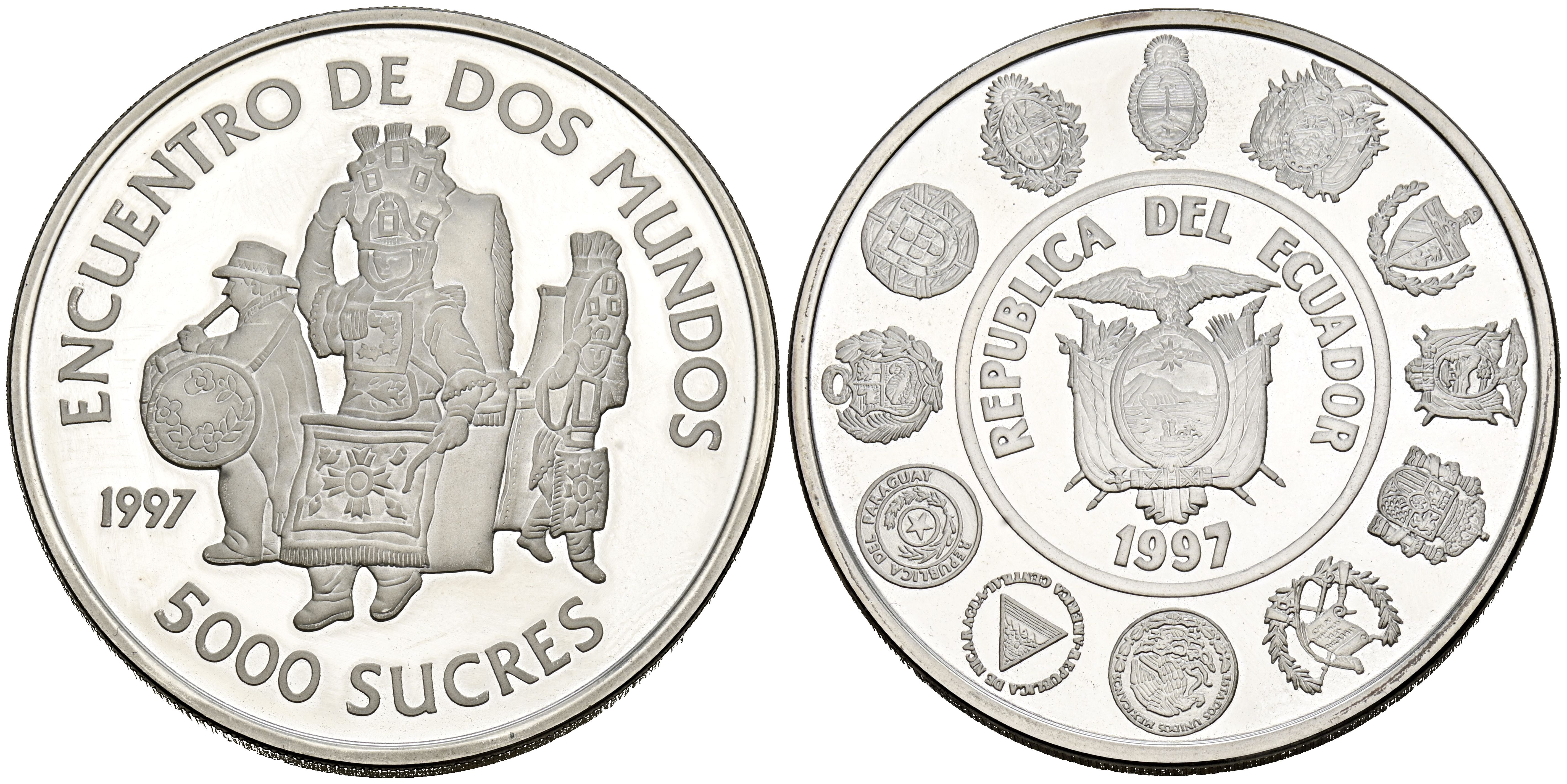 ECUADOR. 5000 Sucres. (Ar. 27,00g/40mm). 1997. Serie Iberoamericana. Danzas Tradicionales. (Km#100). PROOF. Escasa.