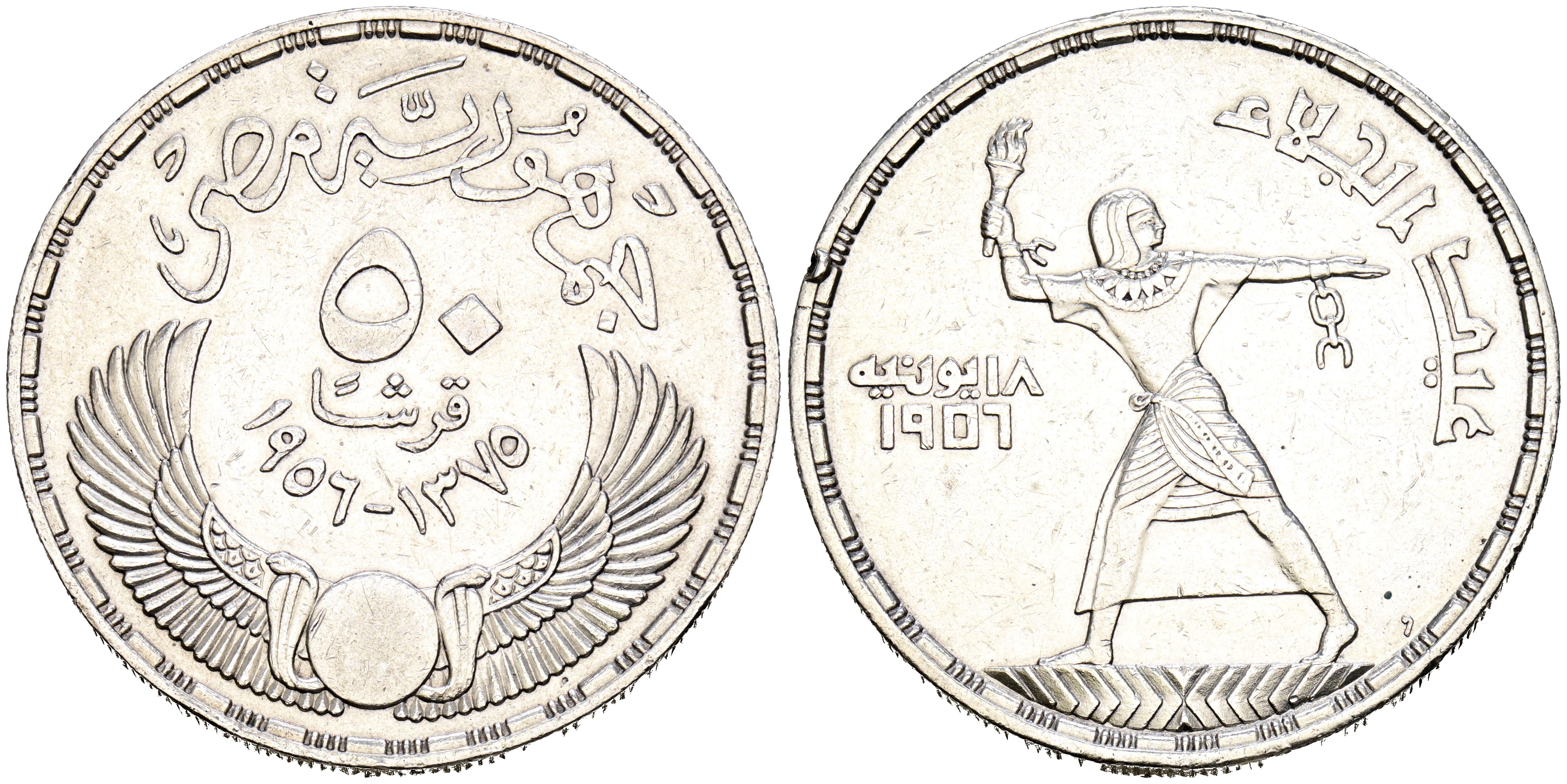 EGIPTO. 50 Piastras. (Ar. 28,00g/40mm). 1956. Gamal Abdel Nasser. (Km#386). MBC.
