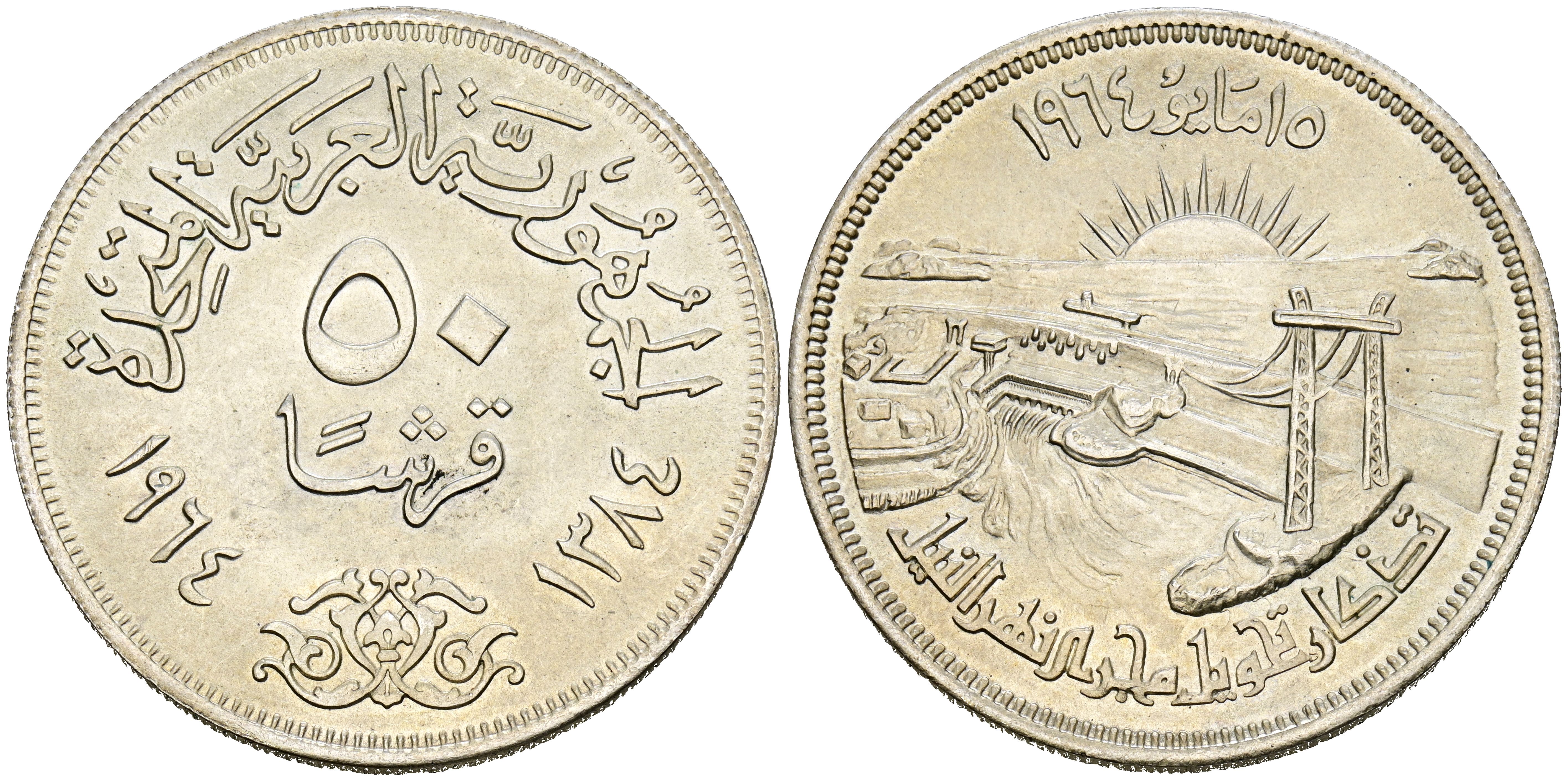 EGIPTO. 50 Piastras. (Ar. 19,53g/40mm). 1964. Desvío del Río Nilo. (Km#407). SC-.