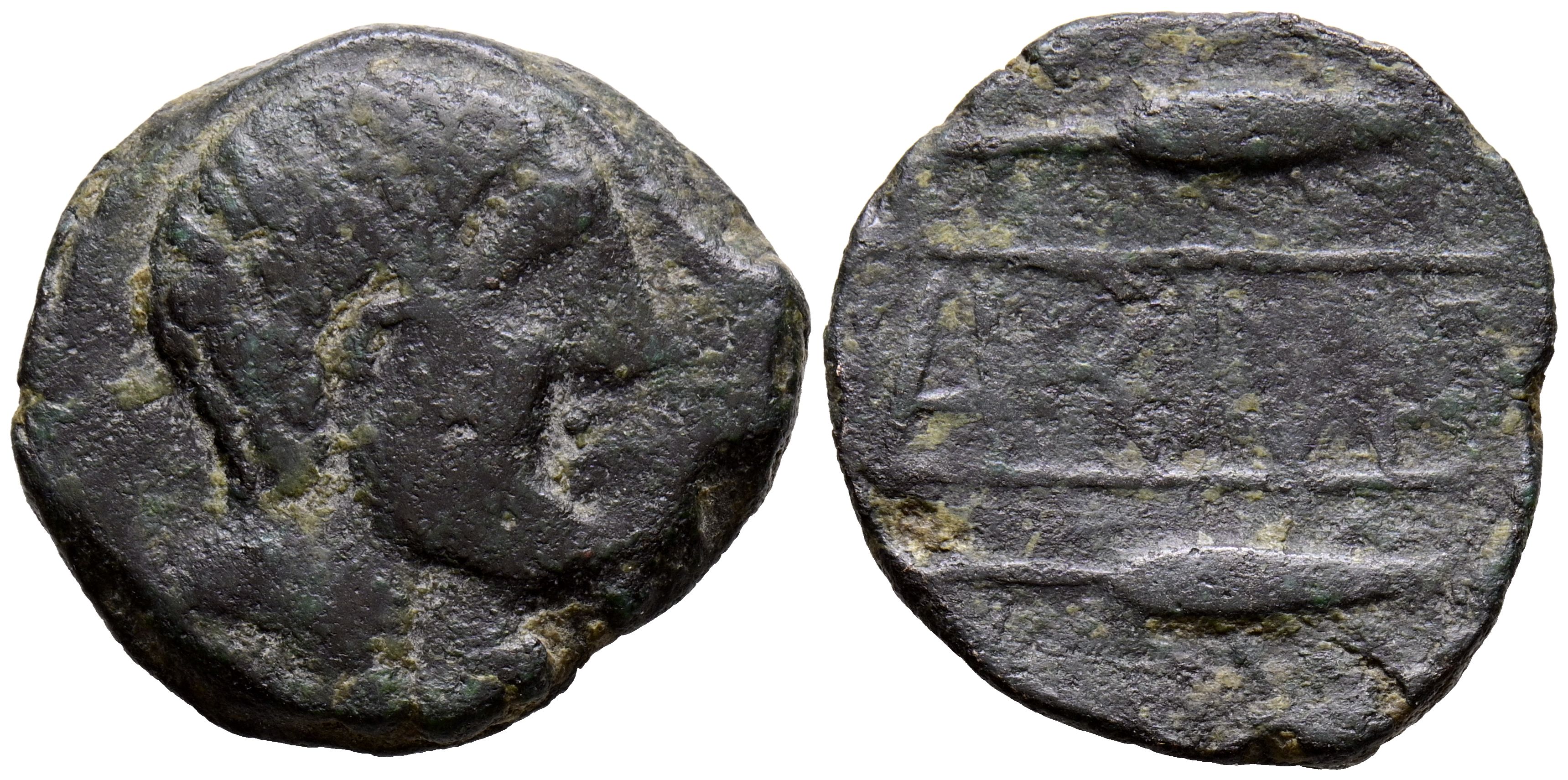 CARMO (Carmona, Sevilla). Semis. (Ae. 8,66g/25mm). 80 a.C. (FAB-459). Anv: Cabeza masculina a derecha. Rev: Dos espigas a derecha, entre ellas leyenda: CARMO. MBC-.