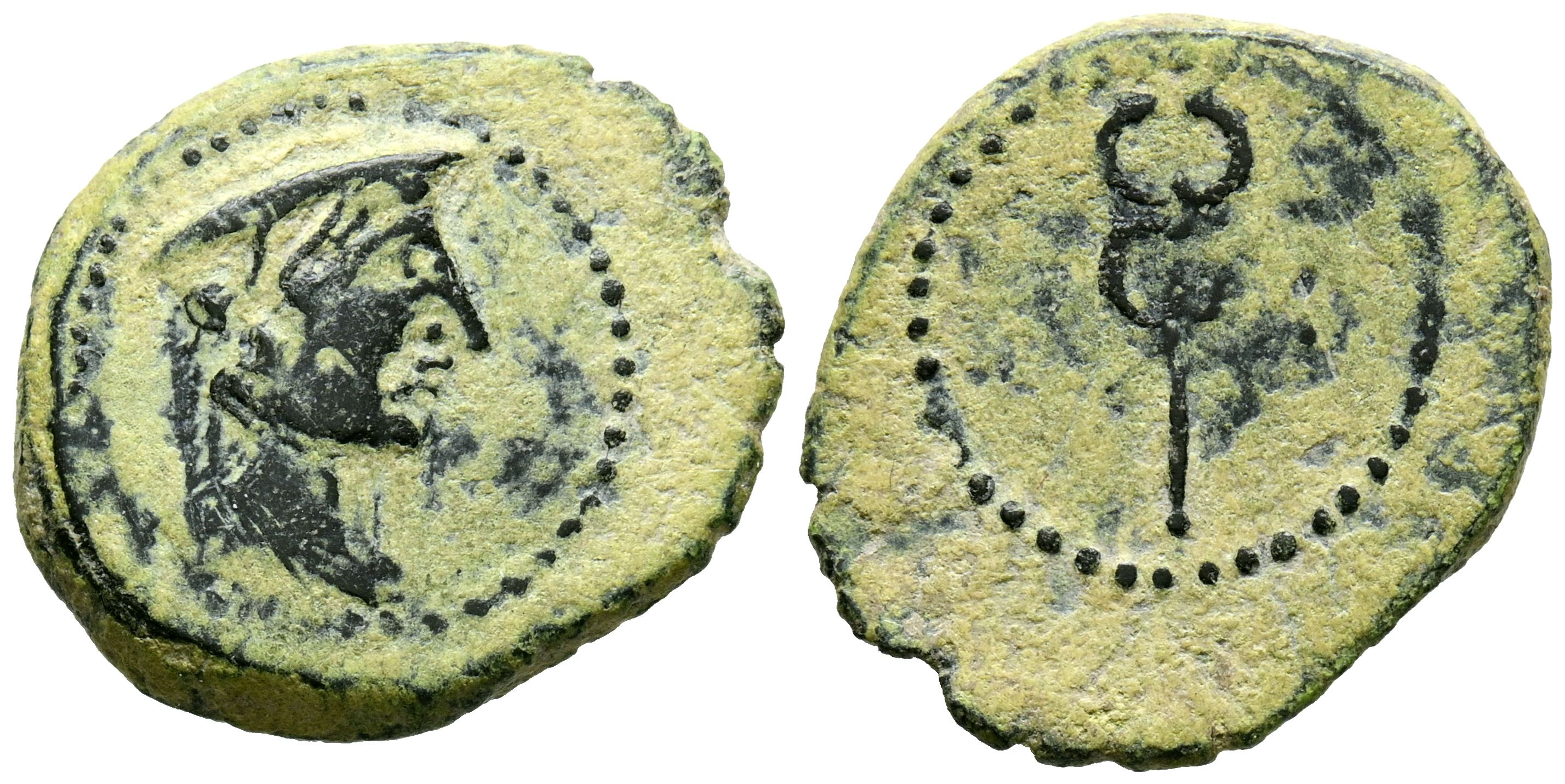CARMO (Carmona, Sevilla). Sextante. (Ae. 3,88g/21mm). 80 a.C. (FAB-473A). Anv: Cabeza de Mercurio a derecha. Rev: Caduceo, tres puntos a derecha. MBC+. Rara.