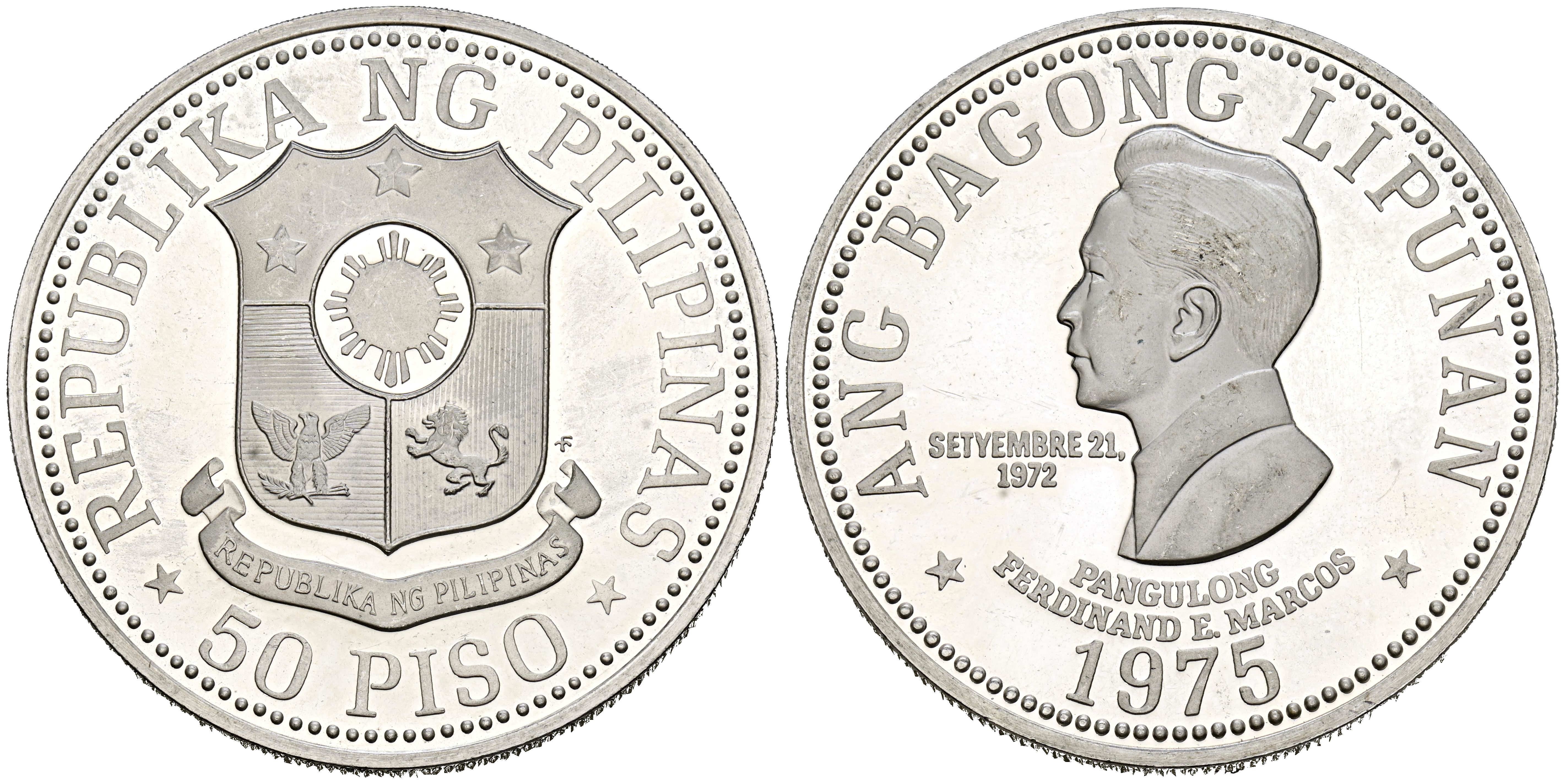 FILIPINAS. 50 Piso. (Ar. 27,66g/40mm). 1975. III Aniversario de la New Society. (Km#212). PROOF.