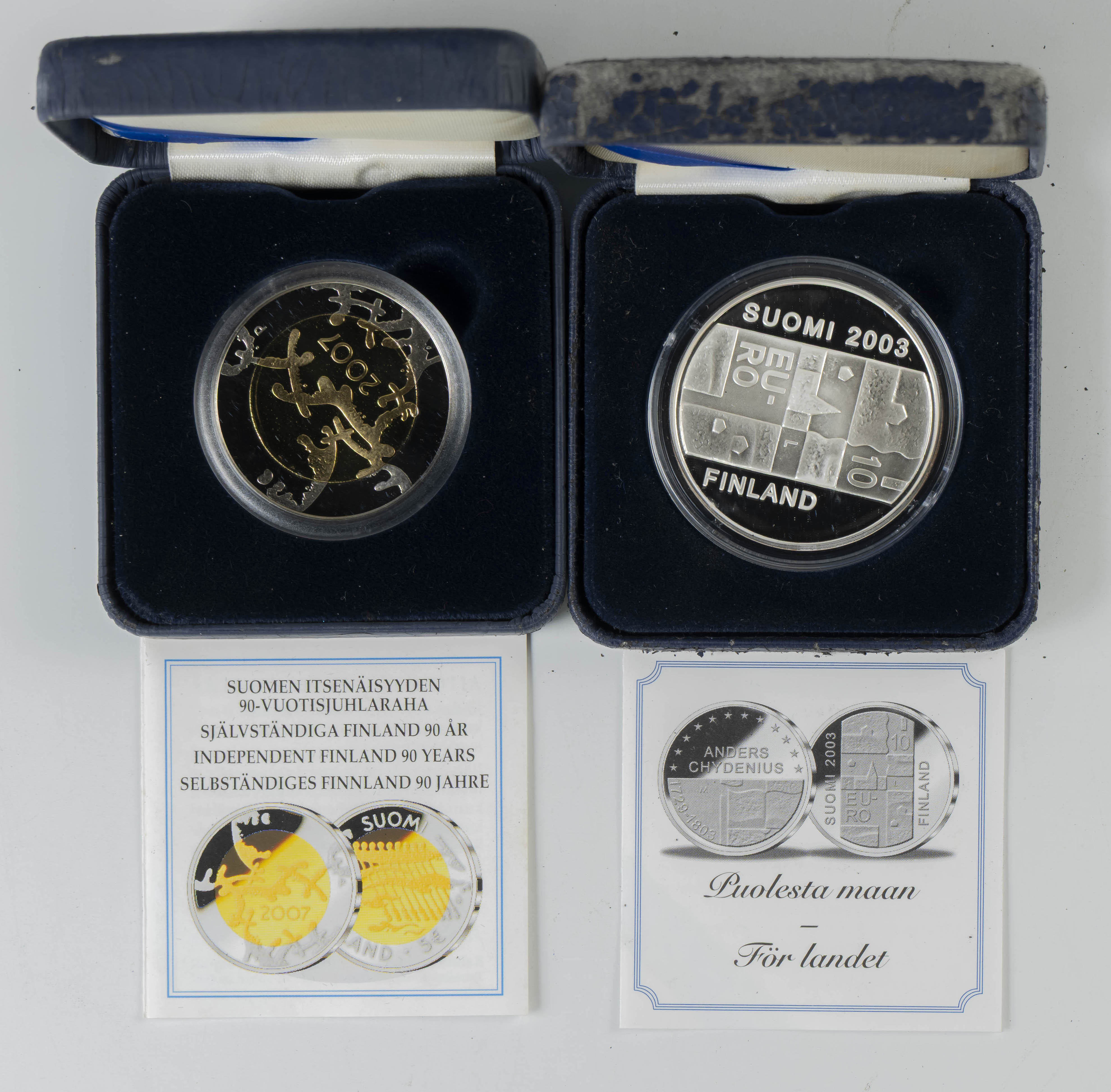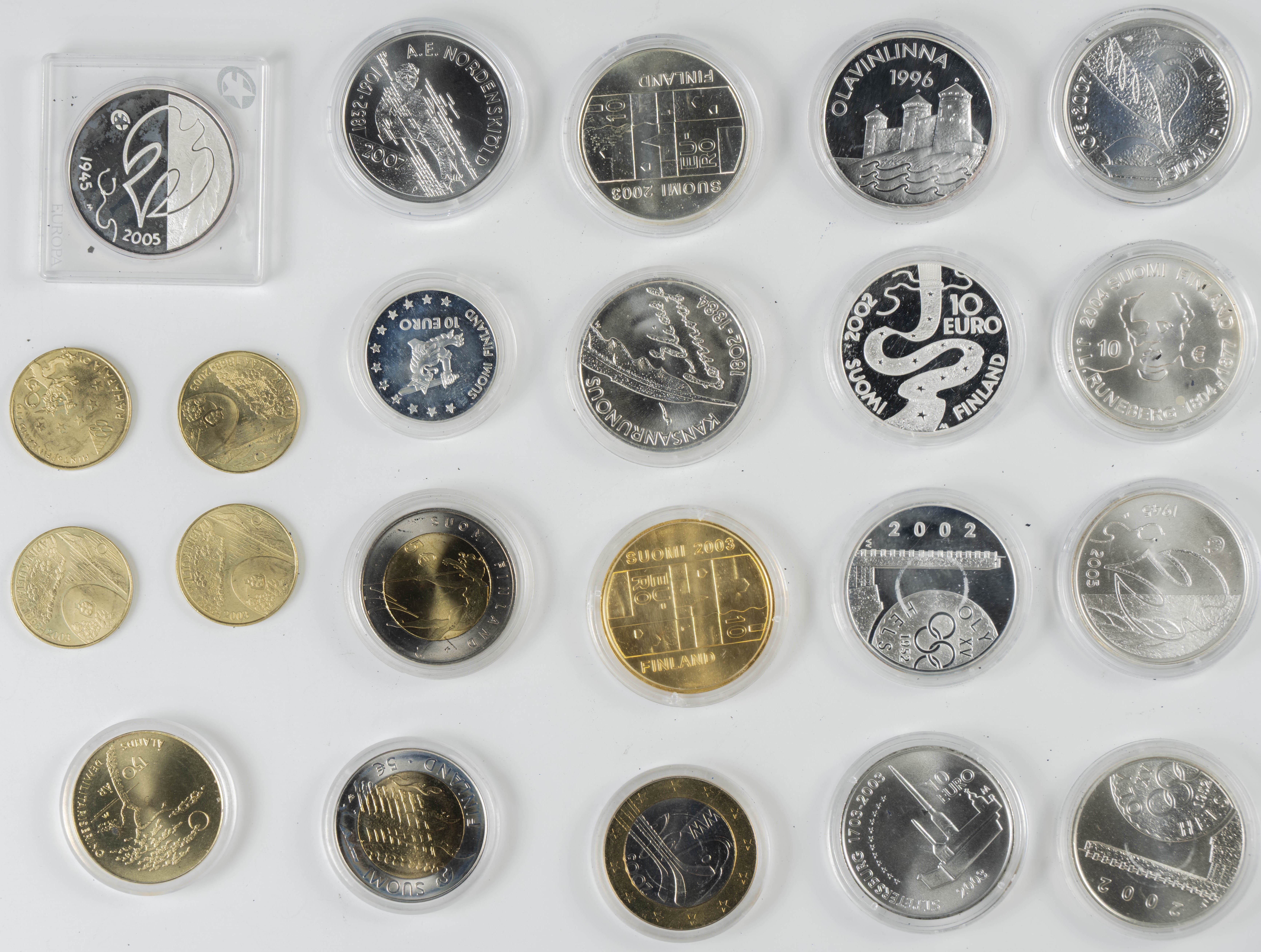FINLANDIA. Interesante conjunto formado por 24 monedas, incluyendo 2 estuches, destacando una notable presencia de piezas conmerativas en plata de 10€. Excelente estado de conservación general, incluyendo terminaciones PROOF. A EXAMINAR.