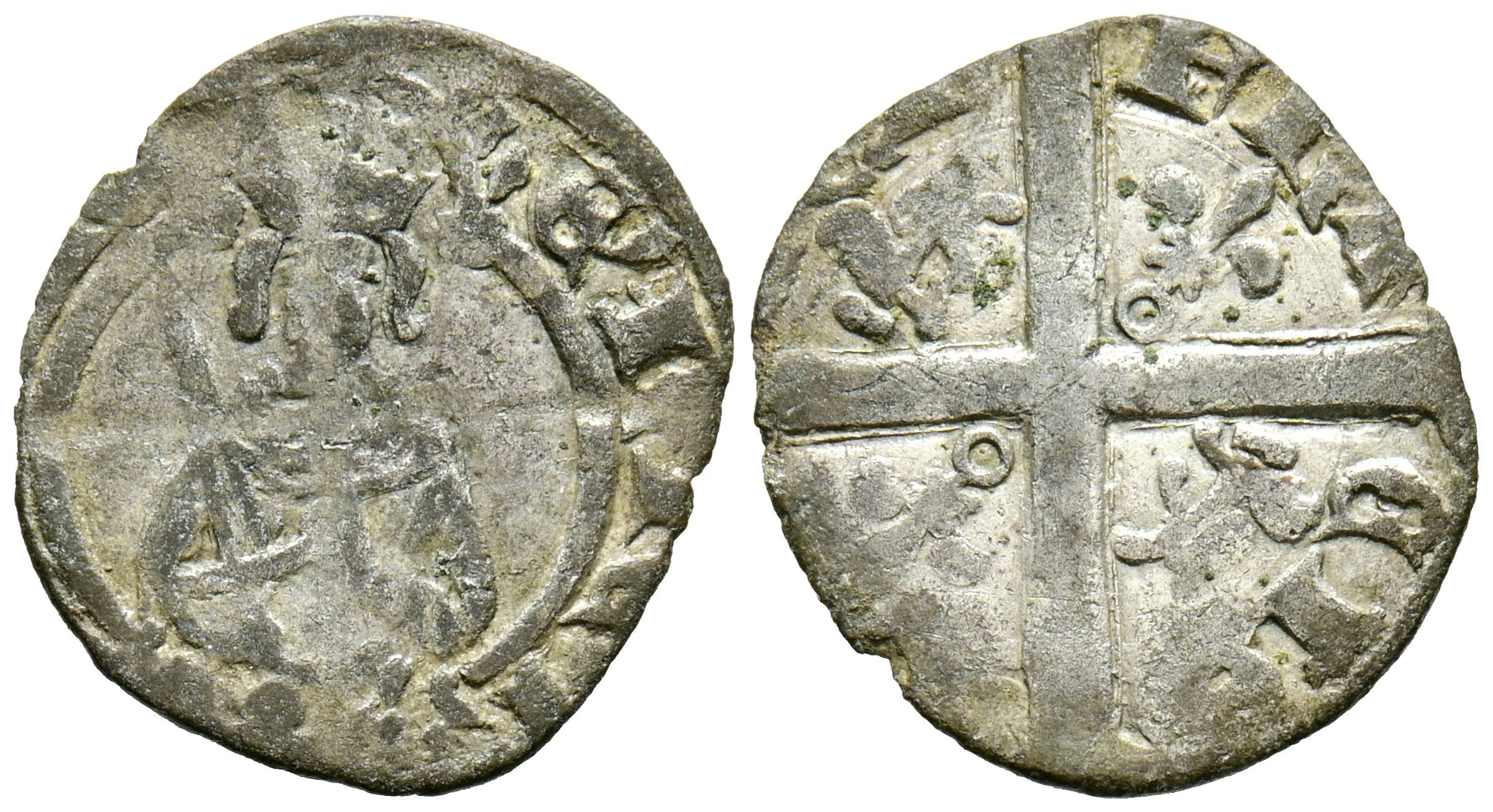 FRANCIA, Eduardo de Woodstock ''el príncipe negro'' (1362-1372). Dinero. (Ar. 0,84g/19mm). 1368. Aquitania. (Duplessy 1126). Anv: Retrato de medio cuerpo de Eduardo estante y de frente portando espada bajo dosel gótico, alrededor leyenda: ED POGENT REGIAGIE. Rev: Cruz potentada alternando lirios y leopardos en los cuartelones, alrededor leyenda: PRN CPS AQPITAN. MBC-.