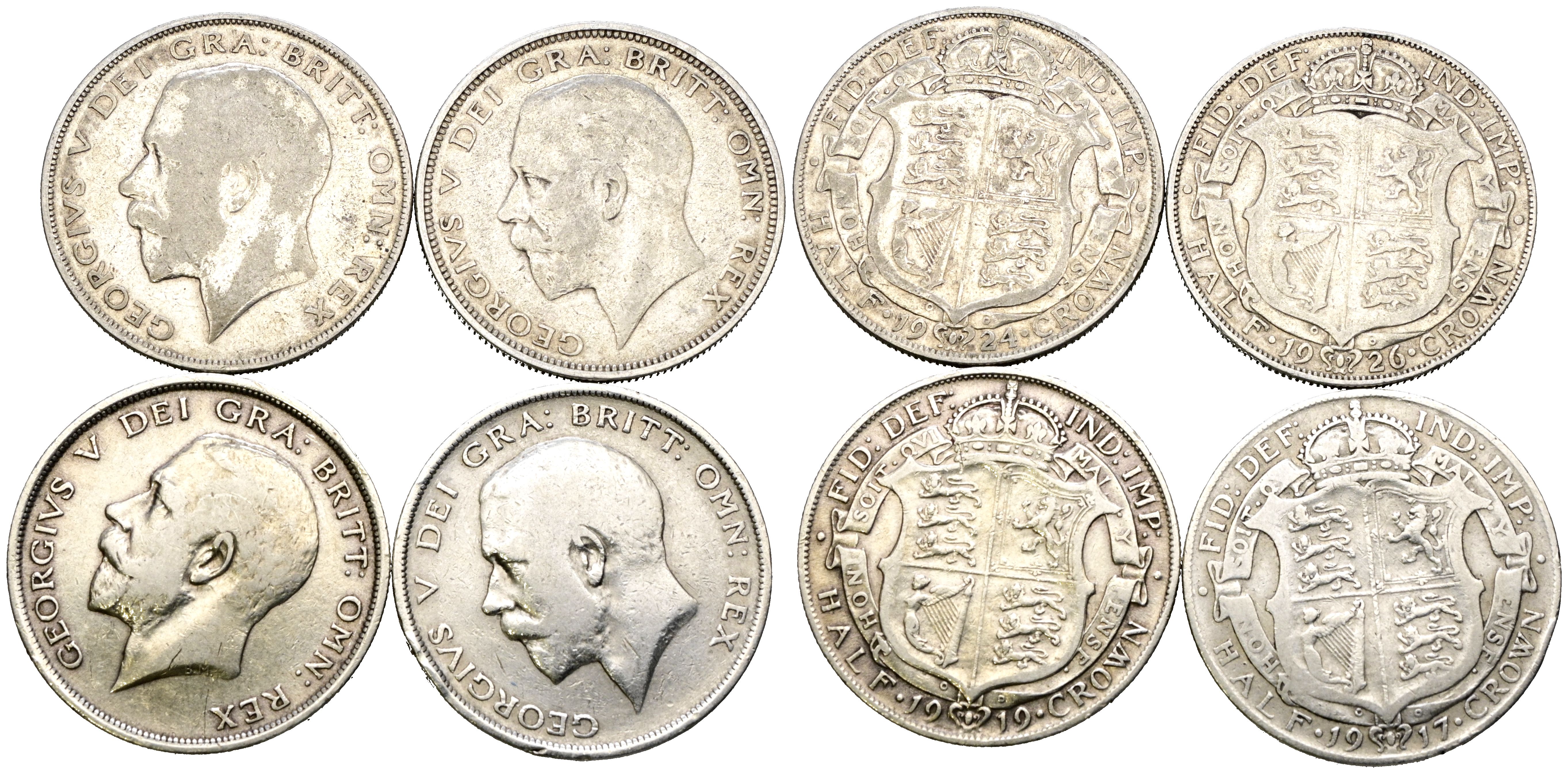 GRAN BRETAÑA. Conjunto de 4 monedas de 1/2 Libra acuñadas bajo el reinado de Jorge V (1917,1919,1924 y 1926). Diferentes estados de conservación. A EXAMINAR.