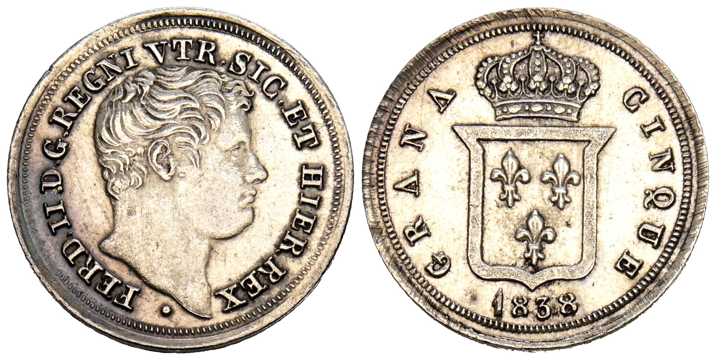 ITALIA, Fernando II. 5 Grana. (Ar. 1,12g/16mm). 1838. Nápoles. (Km#326). EBC-. Bonito ejemplar.