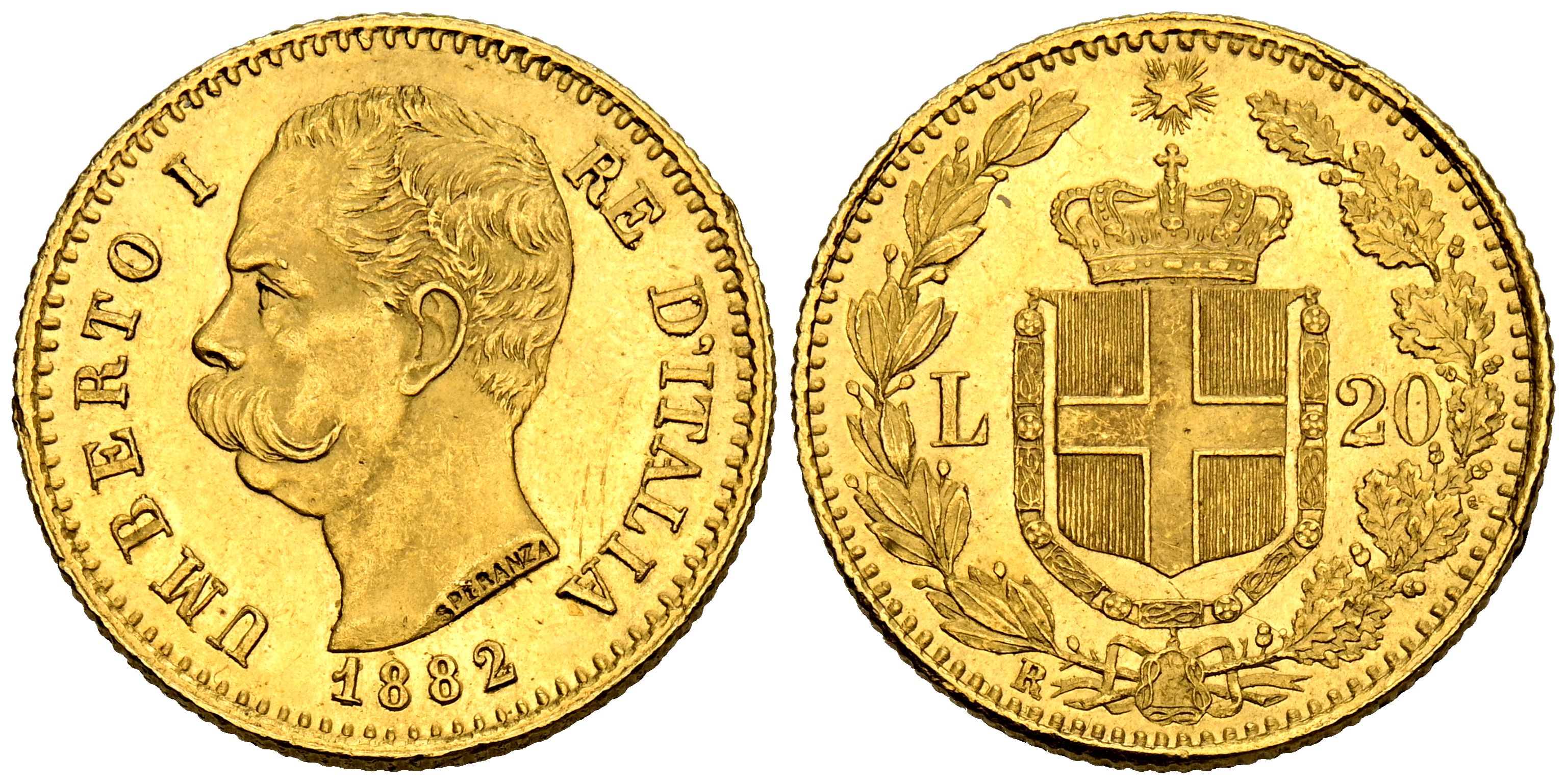 ITALIA, Umberto I. 20 Liras. (Au. 6,45g/21mm). 1882. Roma. (Km#21). MBC+.
