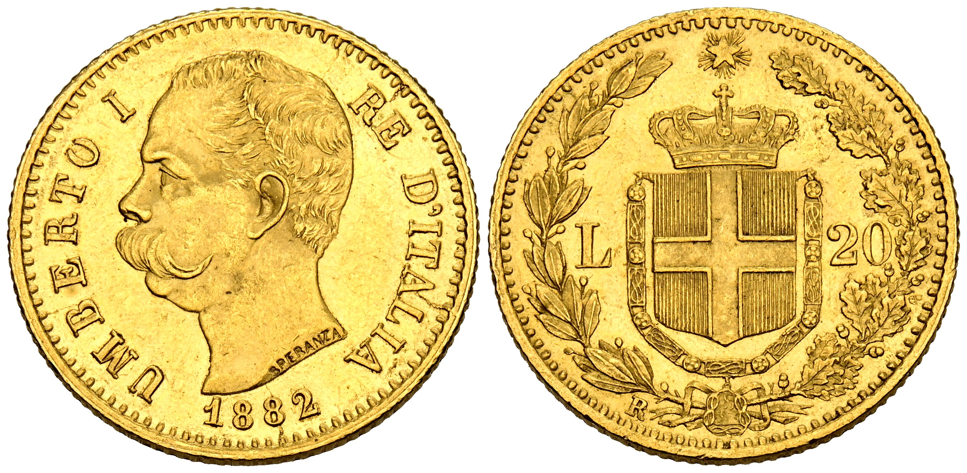 ITALIA, Umberto I. 20 Liras. (Au. 6,44g/21mm). 1882. Roma. (Km#21). MBC+.