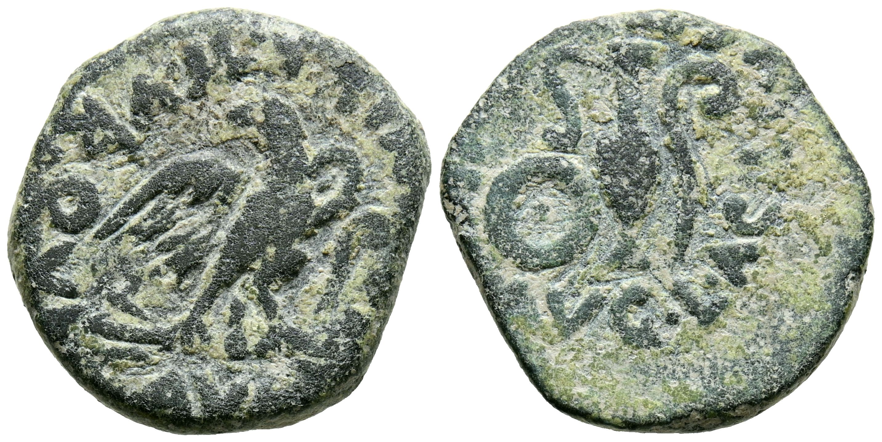 CARTAGONOVA (Cartagena, Murcia). Semis. (Ae. 4,93g/20mm). 27 a.C.-14 d.C. (FAB-583). Anv: Aguila estante sobre rayo mirando a izquierda, alrededor leyenda: L IVNIVS II VIR QVINQ AVG. Rev: Patera, preferículo y lituo, alrededor leyenda: L ACILIVS II VIR QVINQ AVG. BC+.